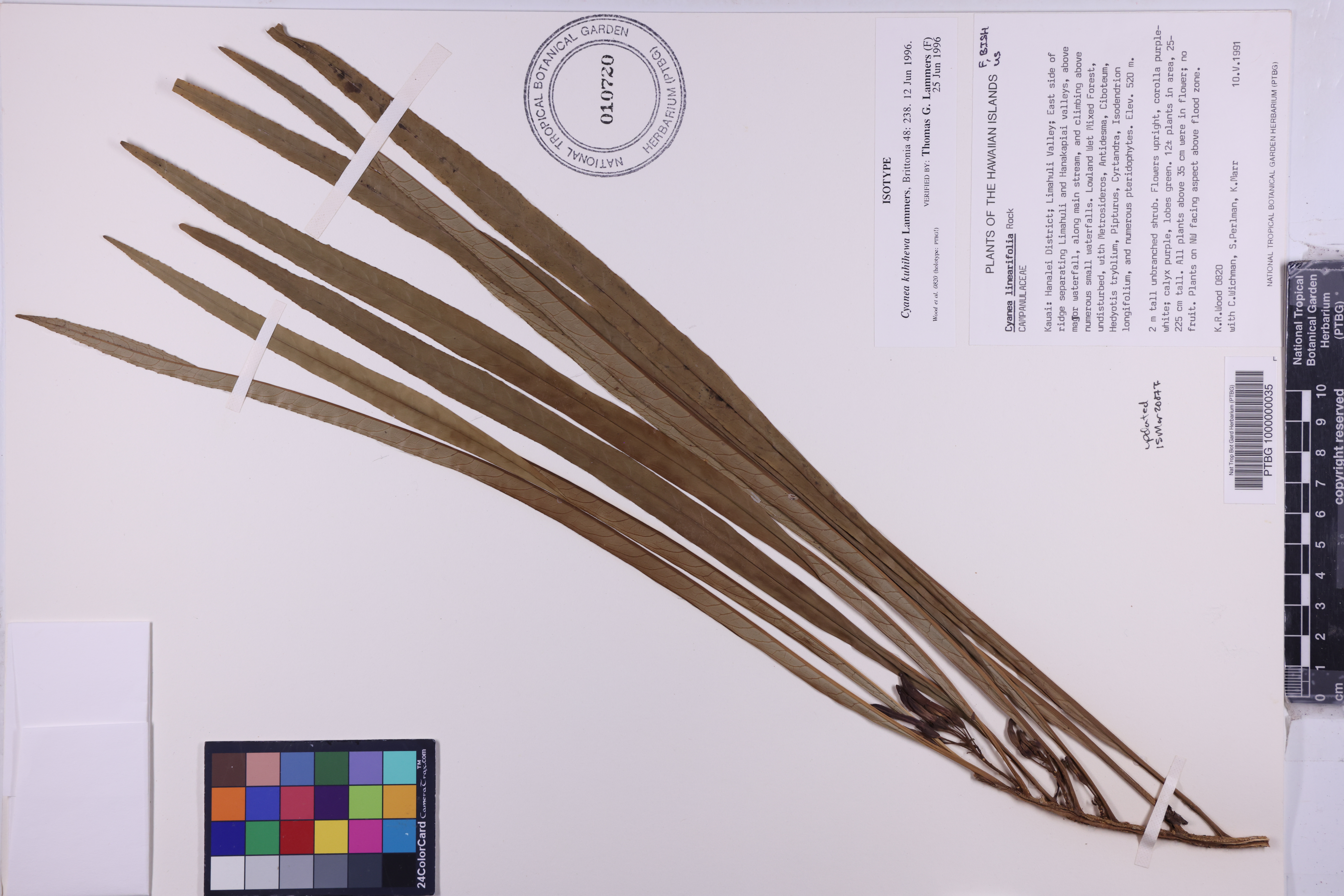 Limahuli Valley; East side of ridge separating Limahuli and Hanakapiai valley s, above major waterfall, along main stream, and climbing ab ove numerous small waterfalls. Lowland wet mixed forest, und isturbed, with Metrosideros, Antidesma, Ciboteum, Hedyotis t ryblium, Pipturus, Cyrtandra, Isodendrion longifolium, and n umerous pteridophytes.