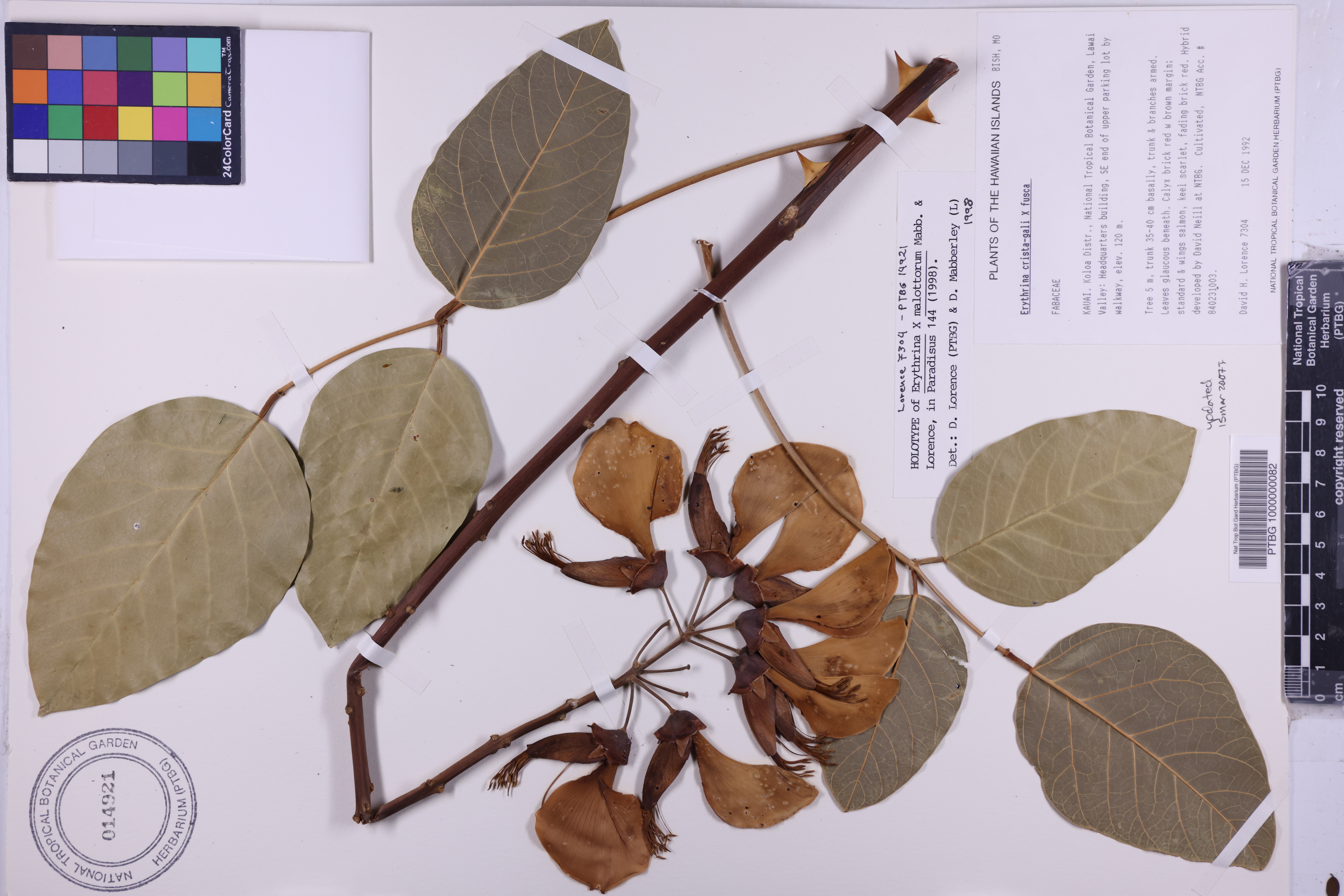 Tree 5 m, trunk 35-40 cm basally, trunk & brnches armed. Lvs . glaucous beneath. Calyx brick red w brn. margin; stand ard & wings salmon, keel scarlet, fading brick red. Hybrid developed by David Neill at NTBG.