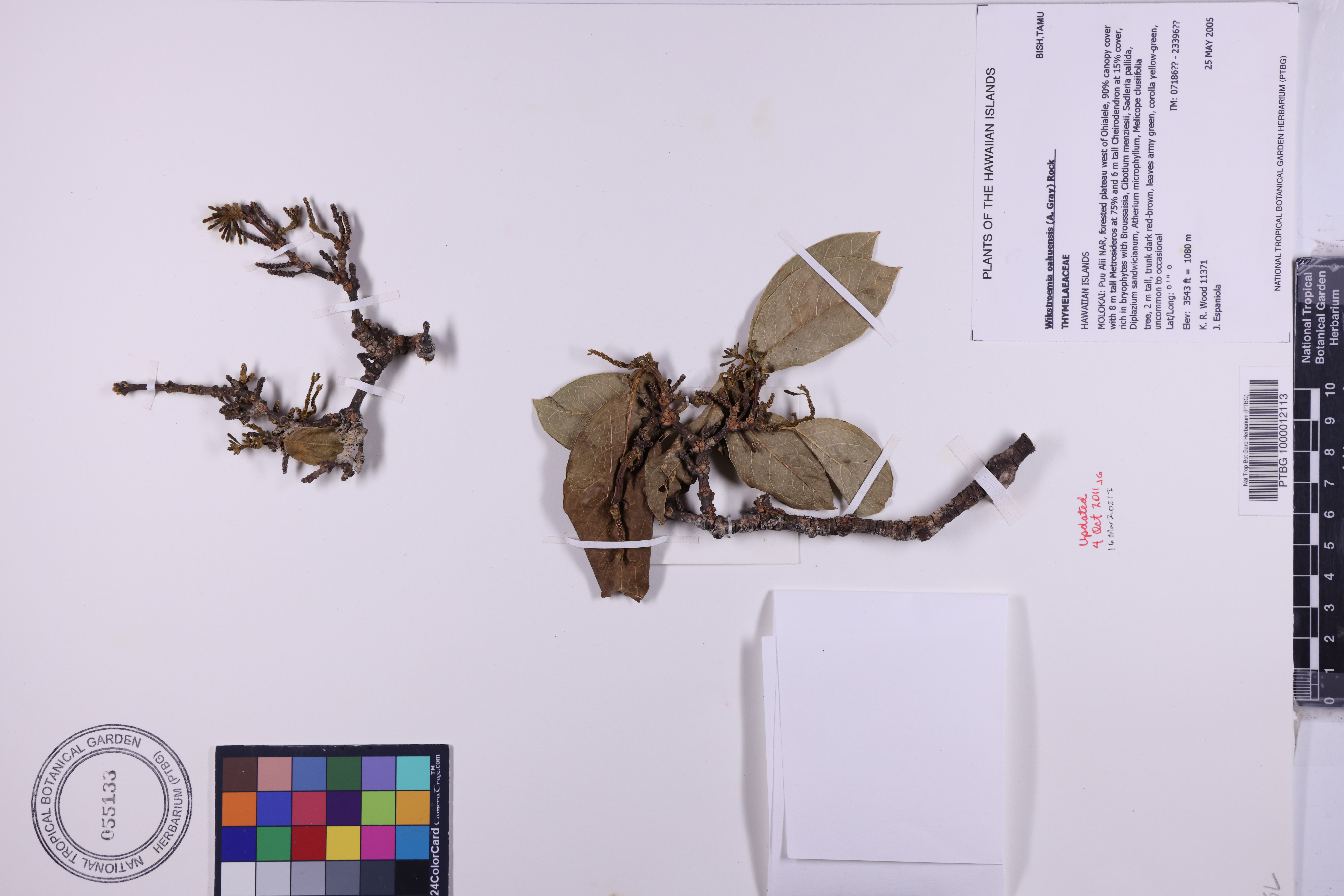 90% canopy cover with 8 m tall Metrosideros at 75% and 6 m tall Cheirodendron at 15% cover, rich in bryophytes with Broussaisia, Cibotium menziesii, Sadleria pallida, Diplazium sandwicianum, Atherium microphyllum, Melicope clusiifolia