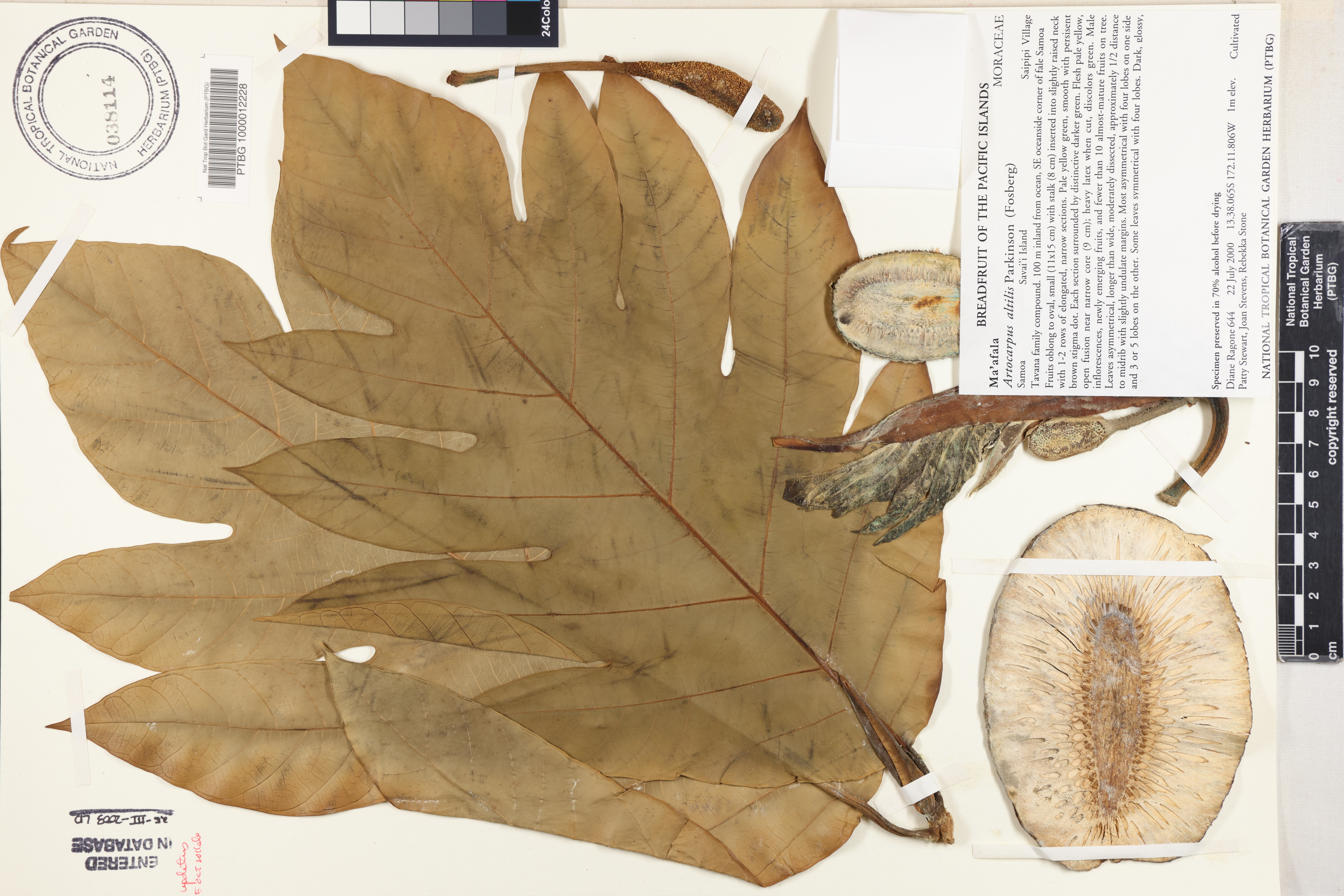 Fruits oblong to oval, small (11 x 15 cm) with stalk (8 cm) inserted into slightly raised neck with 1-2 rows of elongated, narrow sections. Pale yellow green, smooth with persisent brown stigma dot. Each section surrounded by distinctive darker green. Flesh pale yellow, open fusion near narrow core (9 cm); heavy latex when cut, discolors green. Male inflorescences, newly emerginf fruits and fewer than 10 almost-mature fruits on tree. Leaves asymmetrical, longer than wide, modertely dissected, approximately 1/2 distance to midrib with slightly undulate margins. Most asymmetrical with four lobes on one side and 3 or 5 lobes on the other. Some leaves symmetrical with four lobes.