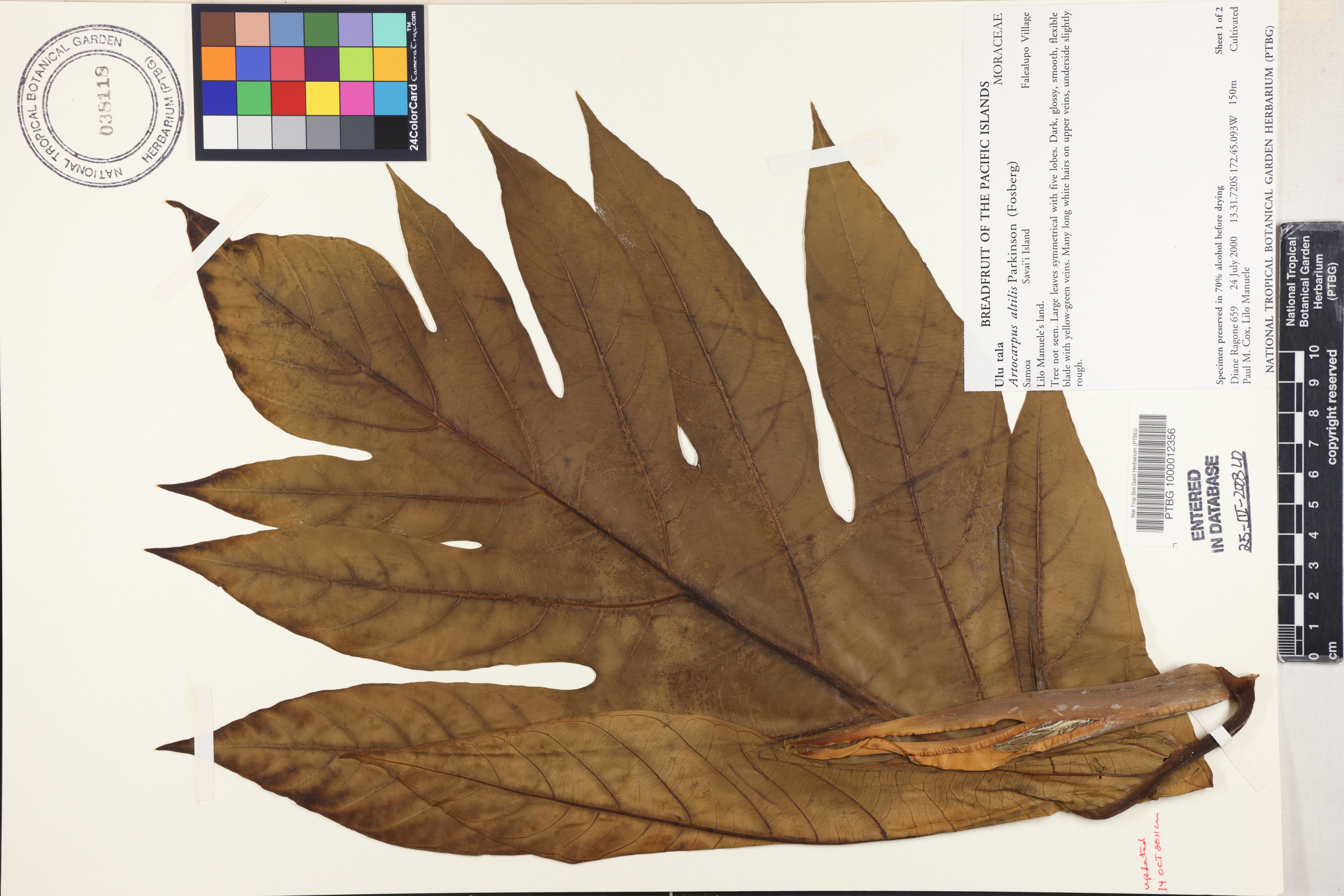Tree not seen. Large leaves symmterical with five lobes. Dark, glossy, smooth, flexible blade with yellow-green veins. Many long white hairs on upper veins, underside slightly rough. Cultivated. Samoan name: Ulu tala
