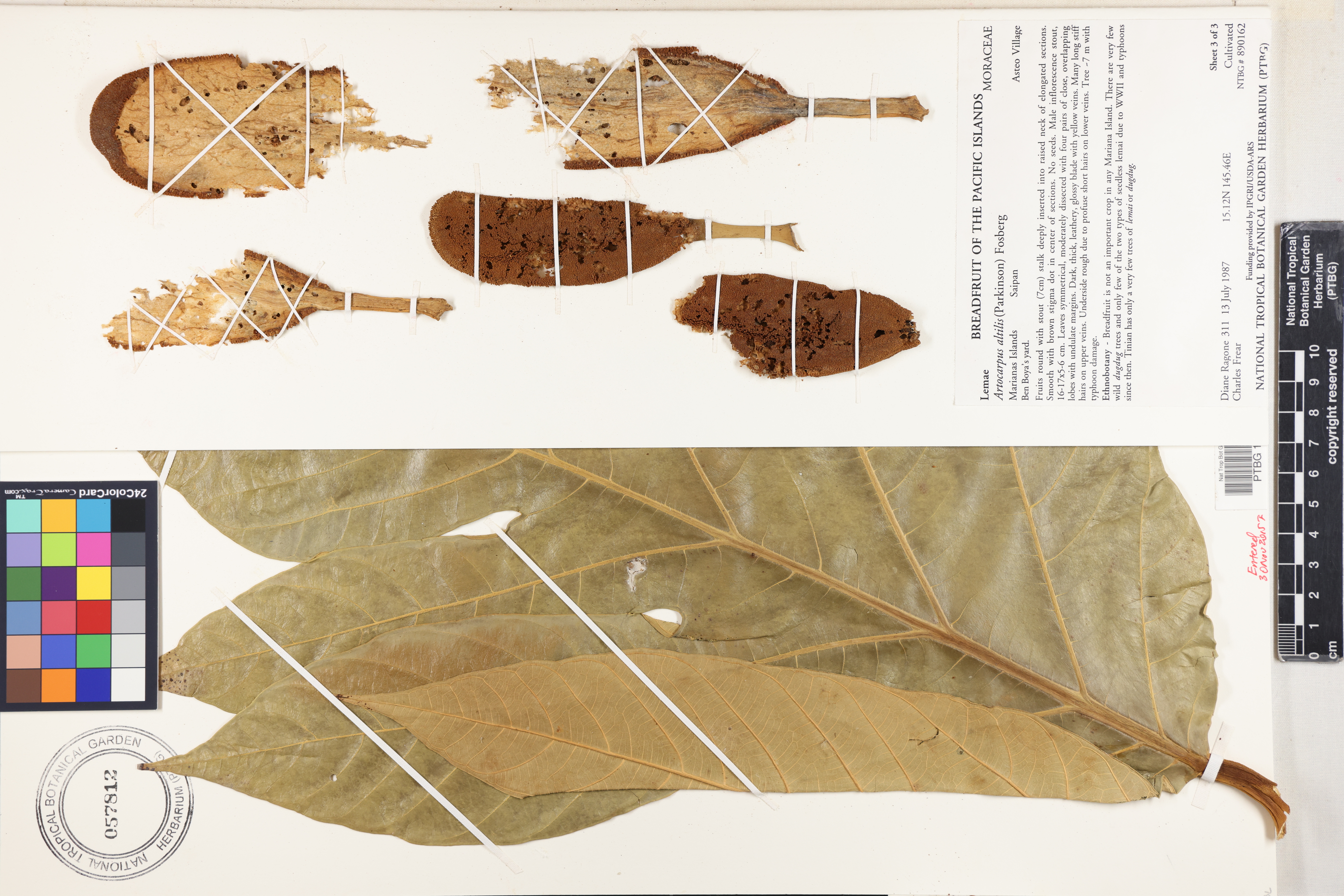 Fruits round with stout (7cm) stalk deeply inserted into raised neck of elongated sections. Smooth with brown stigma dot in center of sections. No seeds. Male inflorescence stout, 16-17x5-6 cm. Leaves symmetrical, moderately dissected with four pairs of close, overlapping lobes with undulate margins. Dark, thick, leathery, glossy blade with yellow veins. Many long stiff hairs on upper veins. Underside rough due to profuse short hairs on lower veins. Tree ~ 7 m with typhoon damage. NTBG acc. #890162
