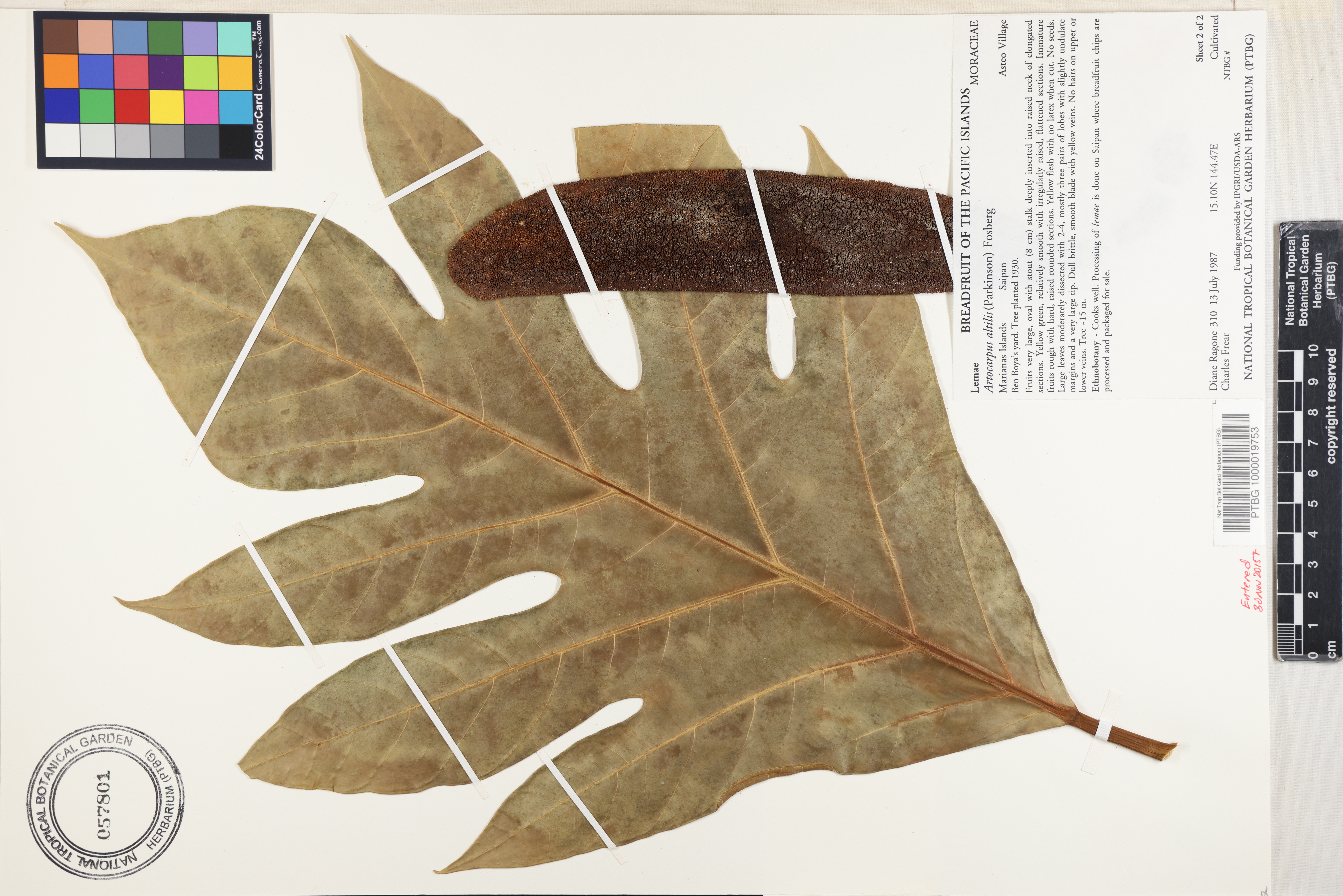 Fruits very large, oval with stout (8 cm) stalk deeply inserted into raised neck of elongated sections. Yellow green, relatively smooth with irregularly raised, flattened section. Immature fruits rough with hard, raised rounded sections. Yellow flesh with no latex when cut. No seeds. Large leaves moderately dissected with 2-4, mostly three pairs of lobes with slightly undulate margins and a very large tip. Dull brittle, smooth blade with yellow veins. No hairs on upper or lower veins. Tree ~15 m tall, planted 1930.