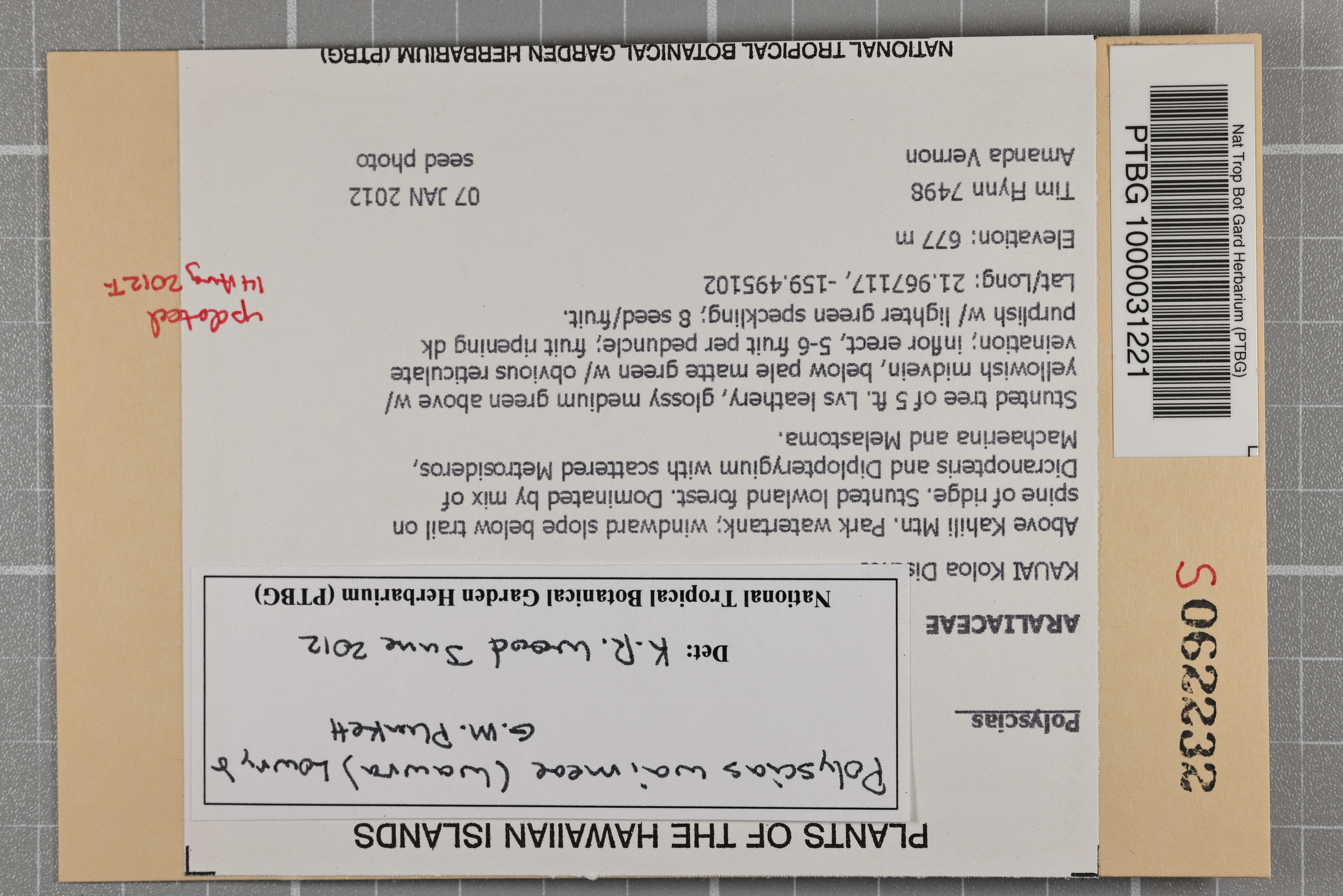 Stunted tree of 5 ft. Lvs leathery, glossy medium green above w/ yellowish midvein, below pale matte green w/ obvious reticulate veination; inflor erect, 5-6 fruit per peduncle; fruit ripening dk purplish w/ lighter green speckling; 8 seed/fruit.
