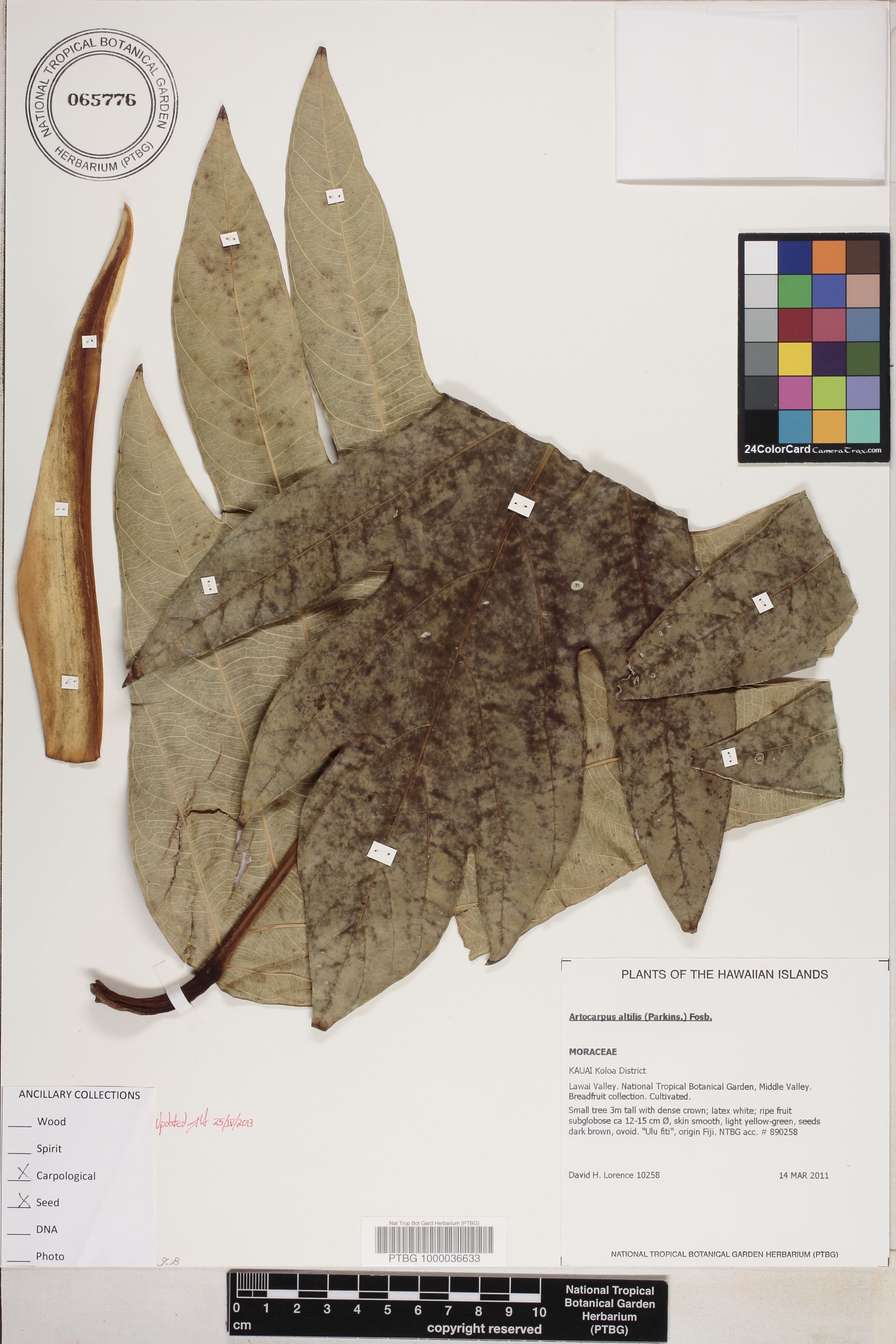 Small tree 3m tall with dense crown; latex white; ripe fruit subglobose ca 12-15 cm Ø, skin smooth, light yellow-green, seeds dark brown, ovoid. Origin Fiji. NTBG acc. # 890258