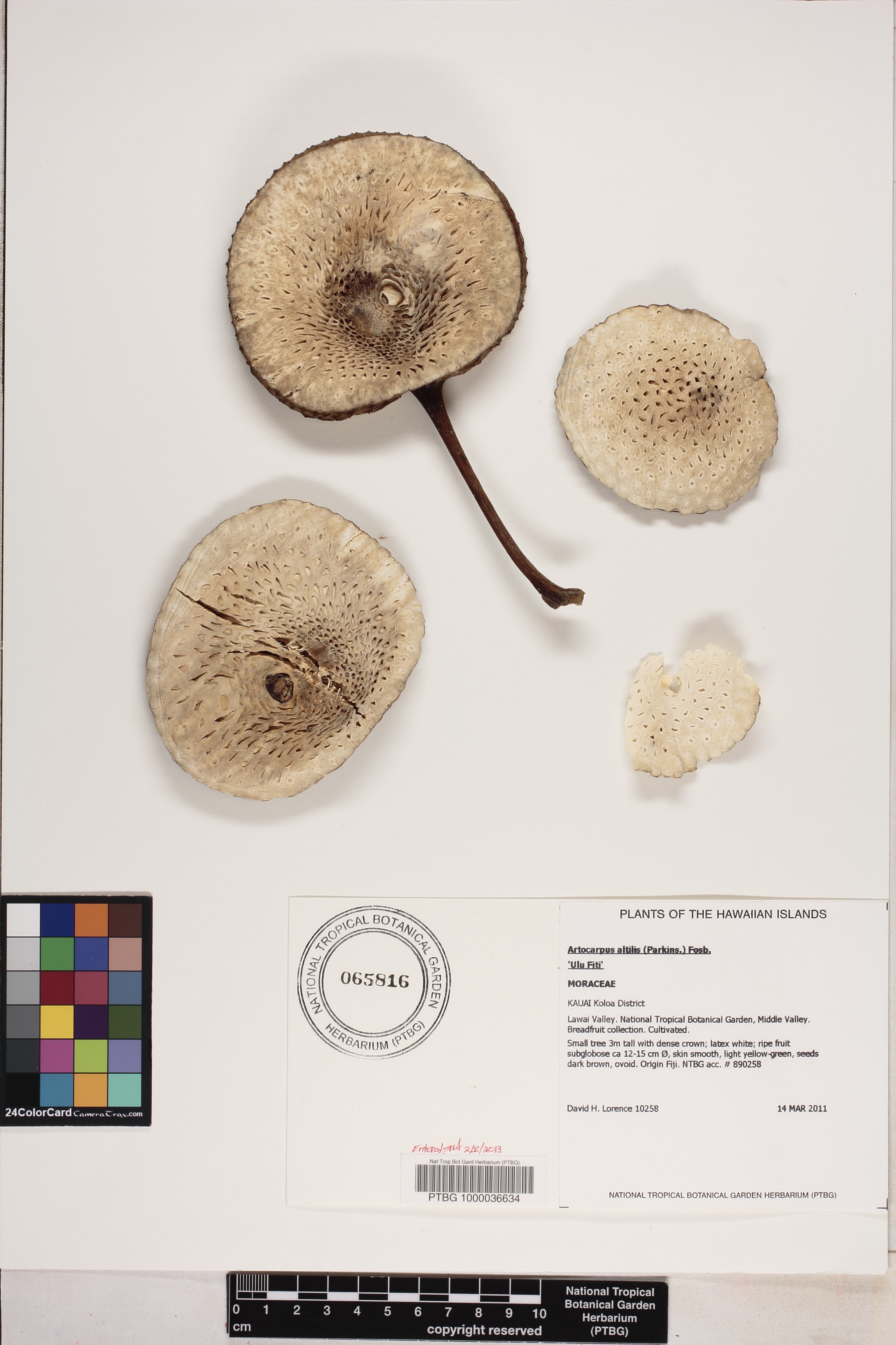 Small tree 3m tall with dense crown; latex white; ripe fruit subglobose ca 12-15 cm Ø, skin smooth, light yellow-green, seeds dark brown, ovoid. Origin Fiji. NTBG acc. # 890258