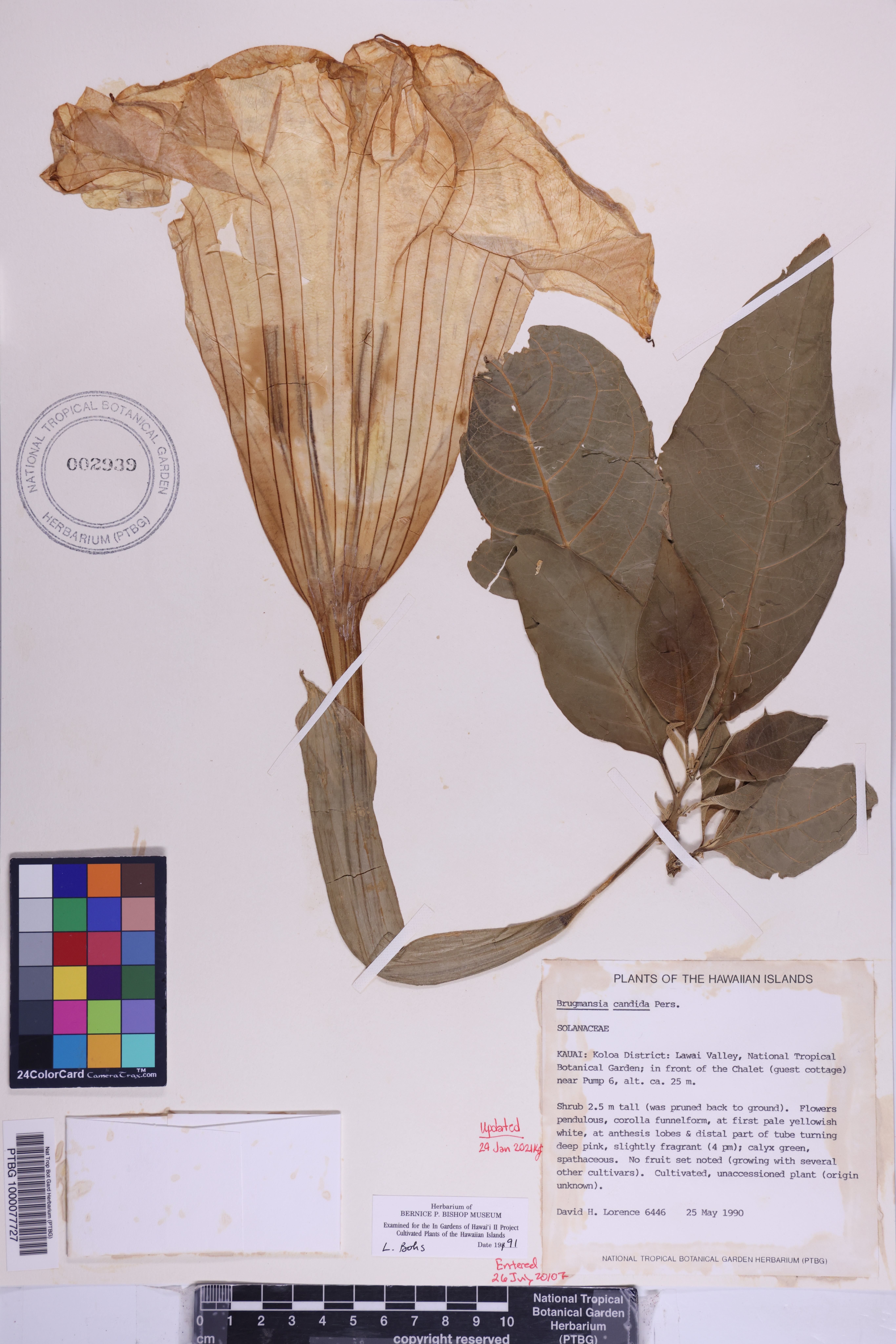 Shrub 2.5m tall (was pruned back to ground). Flowers pendulous, corolla funnelform, at first pale yellowish white, at anthesis lobes & distal part of tube turning deep pink, slightly fragrant (4 pm); calyx green, spathaceous. No fruit set noted (growing with several other cultivars).