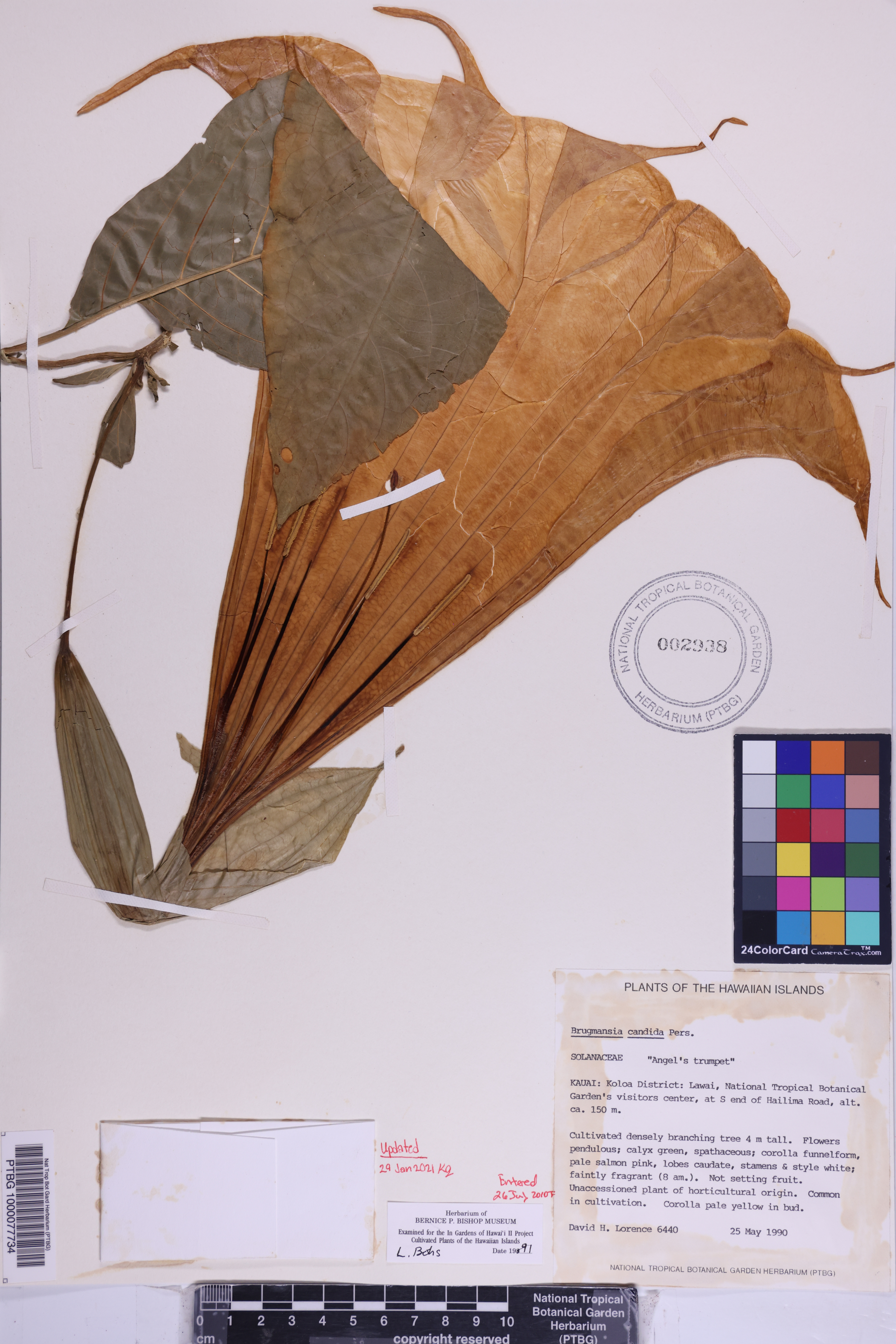 Densely branching tree 4m tall. Flowers pendulous; calyx green, spathaceous; corolla funnelform, pale salmon pink, lobes caudate, stamens & style white; faintly fragrant (8am). Not setting fruit. Corolla pale yellow in bud.