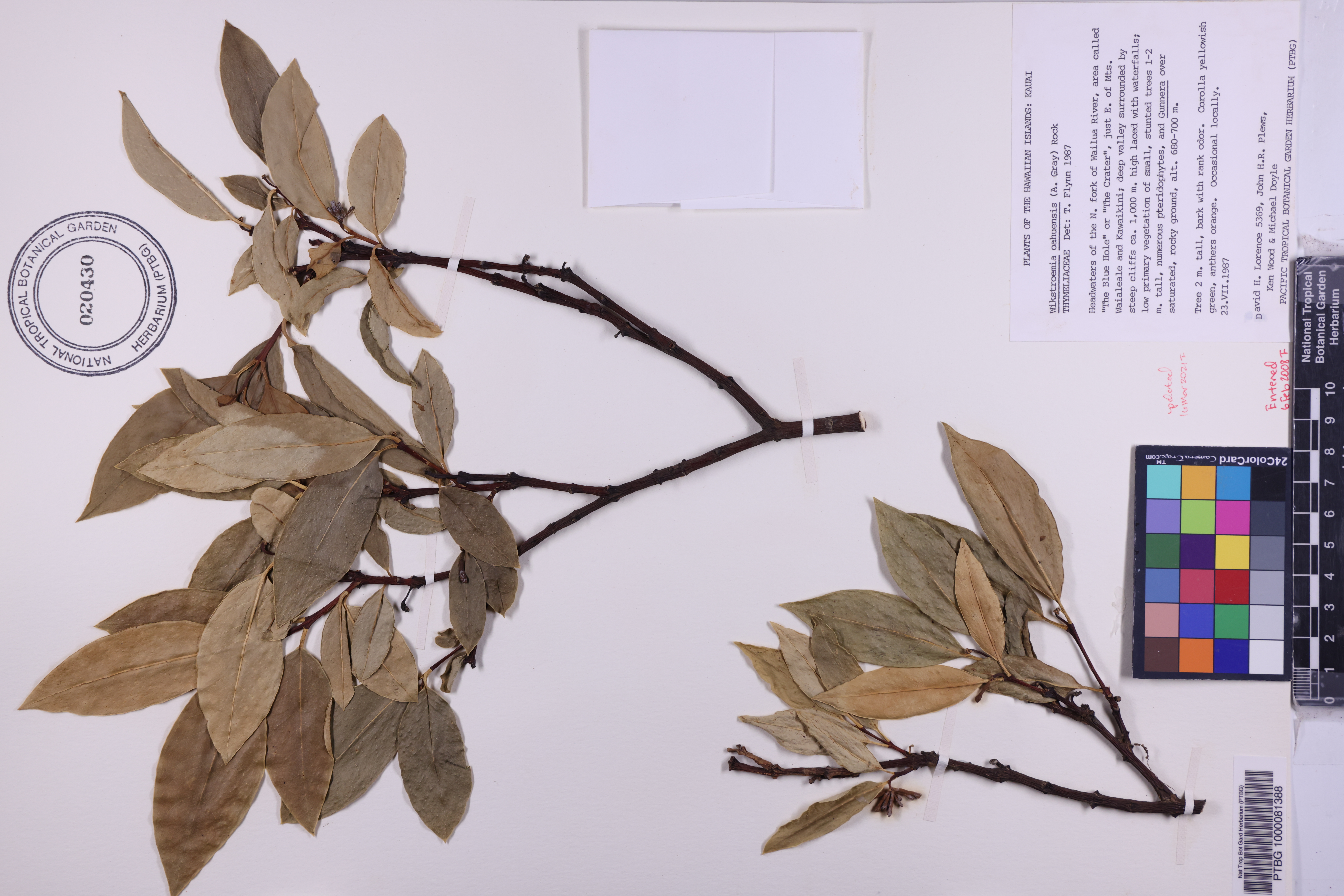 Headwaters of N fork of Wailua River, area called "The Blue Hole" or "The Crater", just E of mts. Waialeale & Kawaikini; deep valley surrounded by steep cliffs ca. 1000 m high laced with waterfalls; Elev. 680-700 m.