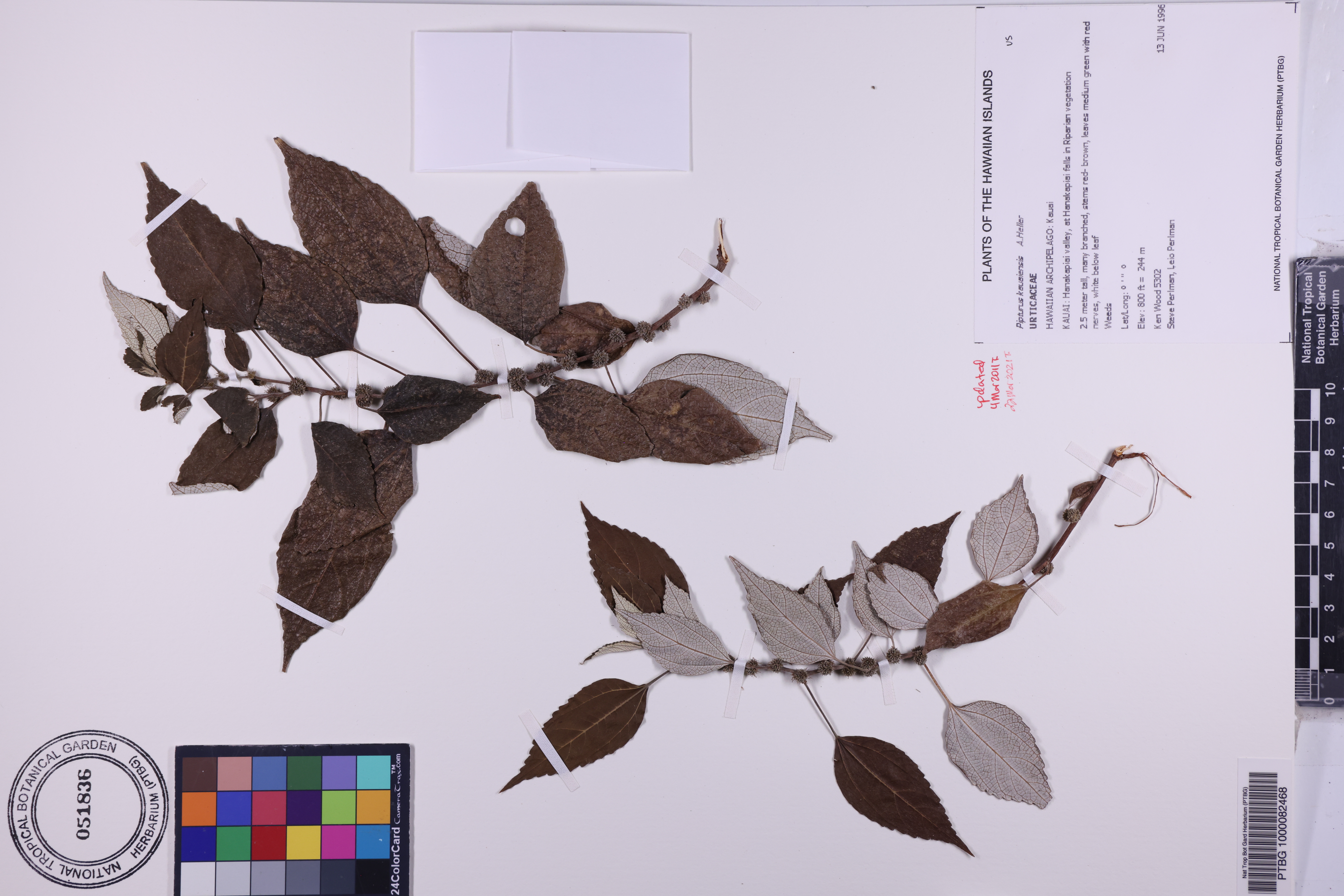 2.5 meter tall, many branched, stems red- brown, leaves medium green with red nerves, white below leaf