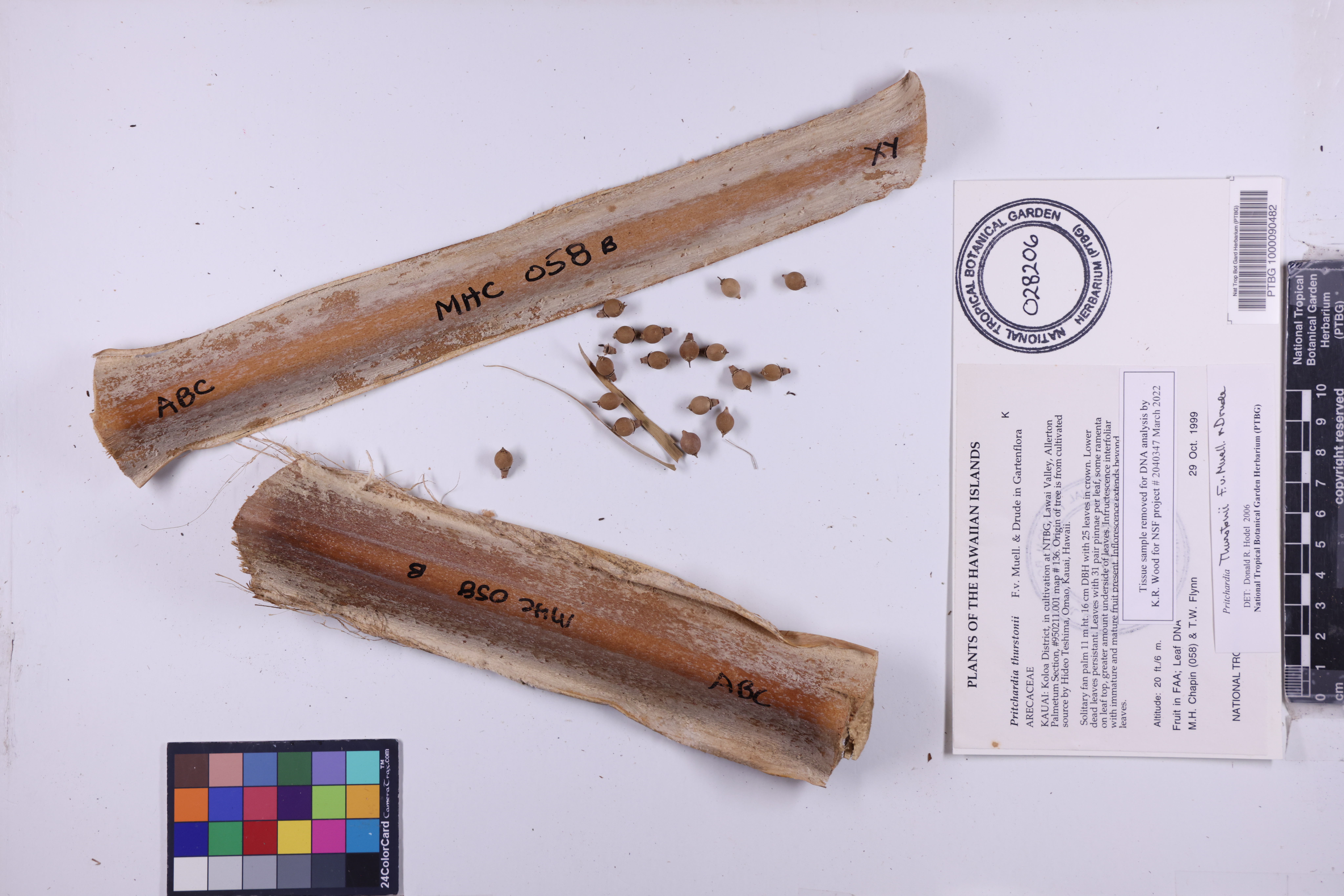 Ele 20 ft/ 6 m. Solitary fan palm 11 m ht. 16 cm DBH with 25 lvs in crown. Lower dead leaves persistant. Leaves with 31 pair pinnae per leaf, some ramenta on leaf top, greater amount underside of leaves. Infructescence interfoliar with immature & mature fruit present. Inflorescence extends beyond leaves.