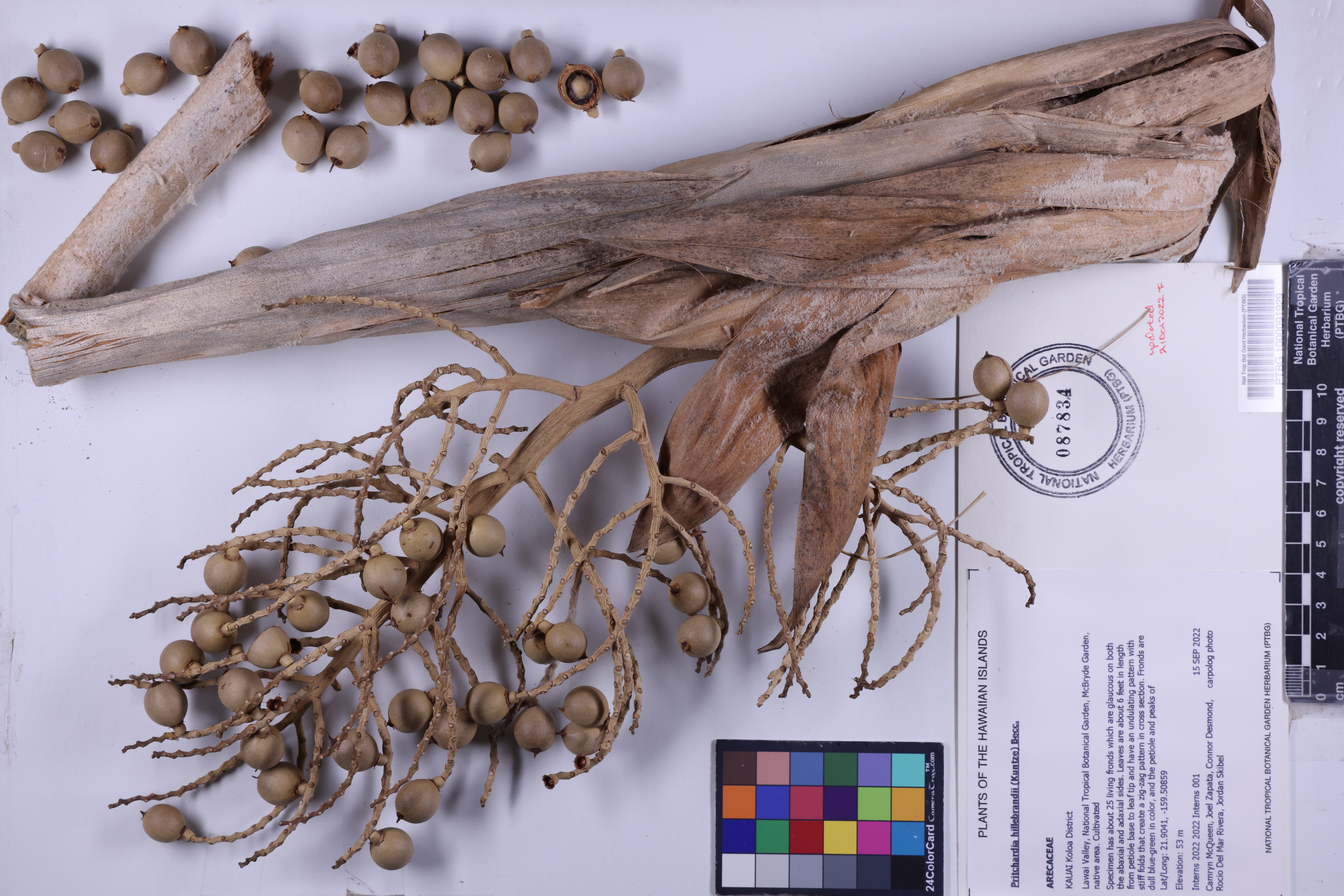 Specimen has about 25 living fronds which are glaucous on both the abaxial and adaxial sides. Leaves are about 6 feet in length from petiole base to leaf tip and have an undulating pattern with stiff folds that create a zig-zag pattern in cross section. Fronds are dull blue-green in color, and the petiole and peaks of the leaf folds on the abaxial side are densely tomentose. The lower half of the plant consists of dead drooping foliage and the top half consists of turgid upright fronds. The palm is of a single stem and the height from the top of the canopy to the base is about 12 feet. There were about 1-2 branches in the inflorescence and the inflorescence is about the same length as the petiole. The fruits appear to be immature but show a light olive-green color. The branches of the inflorescence are yellow. NTBG acc. #20140098002