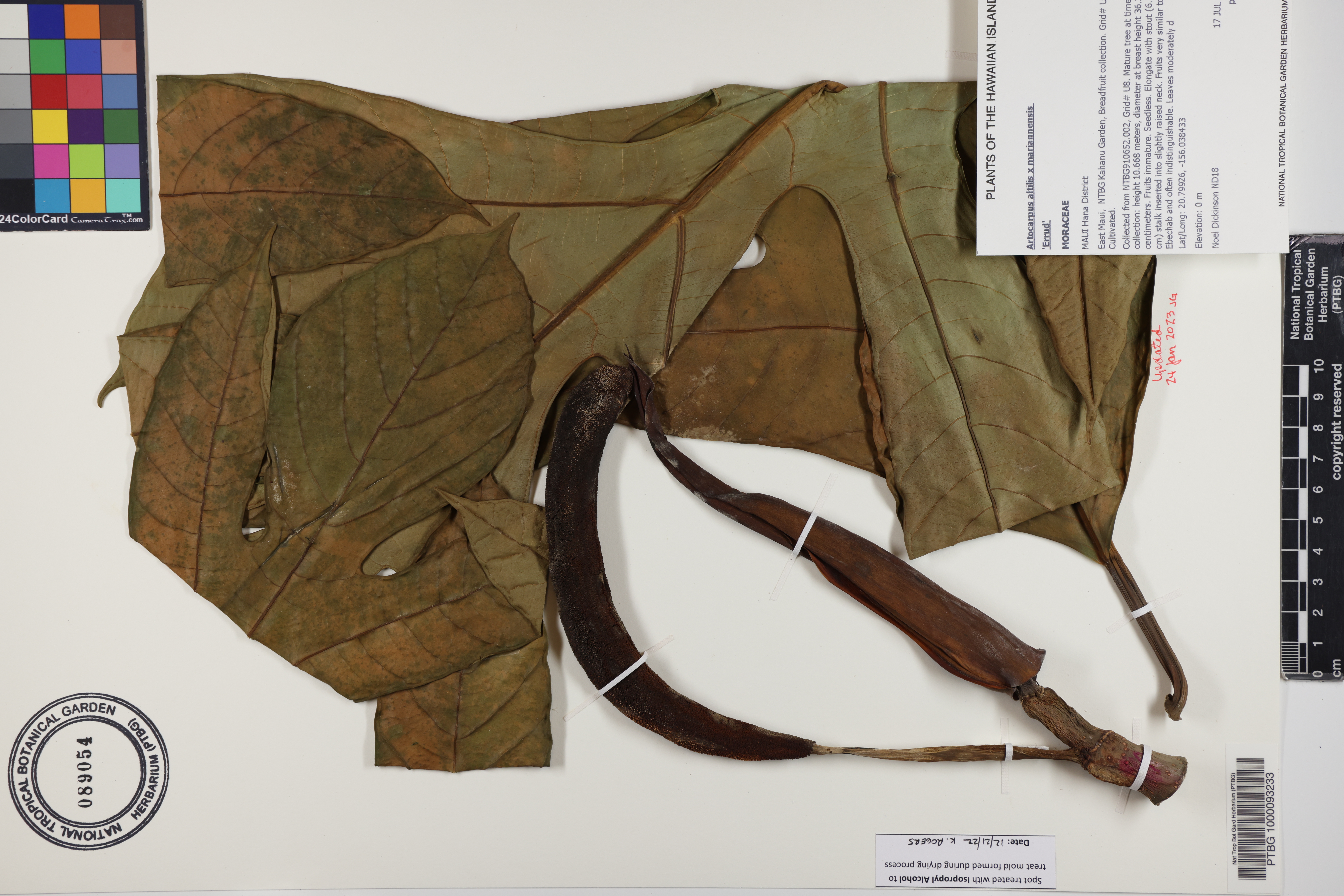 Collected from NTBG910652.002, Grid# U8. Mature tree at time of collection: height 10.668 meters, diameter at breast height 36.39 centimeters. Fruits immature. Seedless. Elongate with stout (6.5 cm) stalk inserted into slightly raised neck. Fruits very similar to Ebechab and often indistinguishable. Leaves moderately dissected with 3-4 pairs of lobes. Smooth, glossy blade with yellow veins. No hairs on upper or lower surfaces. Fruit and male flowers present (July). Also called Chebiei. Refer to Collectors ID ND65.