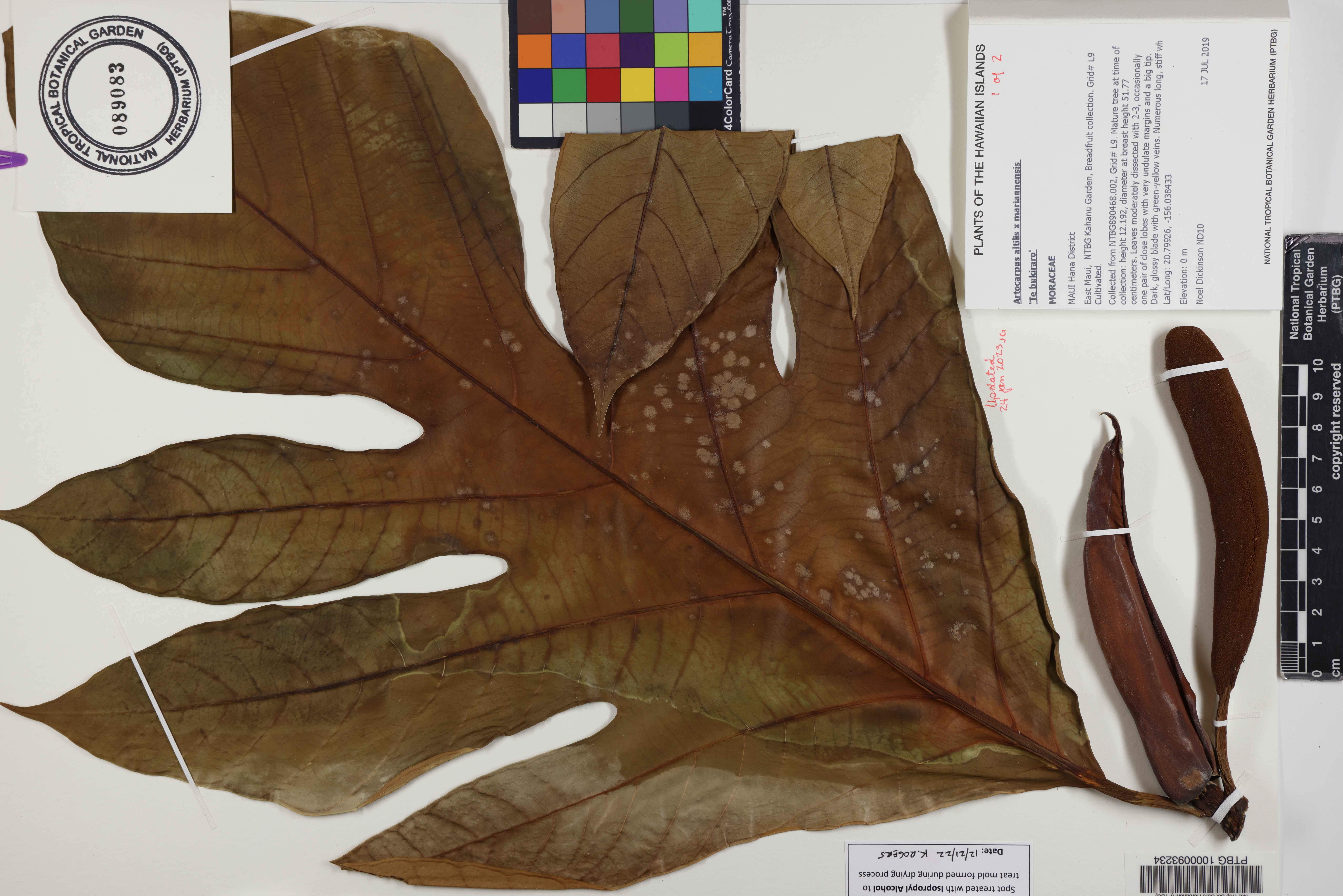 Collected from NTBG890468.002, Grid# L9. Mature tree at time of collection: height 12.192, diameter at breast height 51.77 centimeters. Leaves moderately dissected with 2-3, occasionally one pair of close lobes with very undulate margins and a big tip. Dark, glossy blade with green-yellow veins. Numerous long, stiff white hairs on upper veins. Underside slightly rough. Very productive cultivar. Fruit present and male flowers present (July).