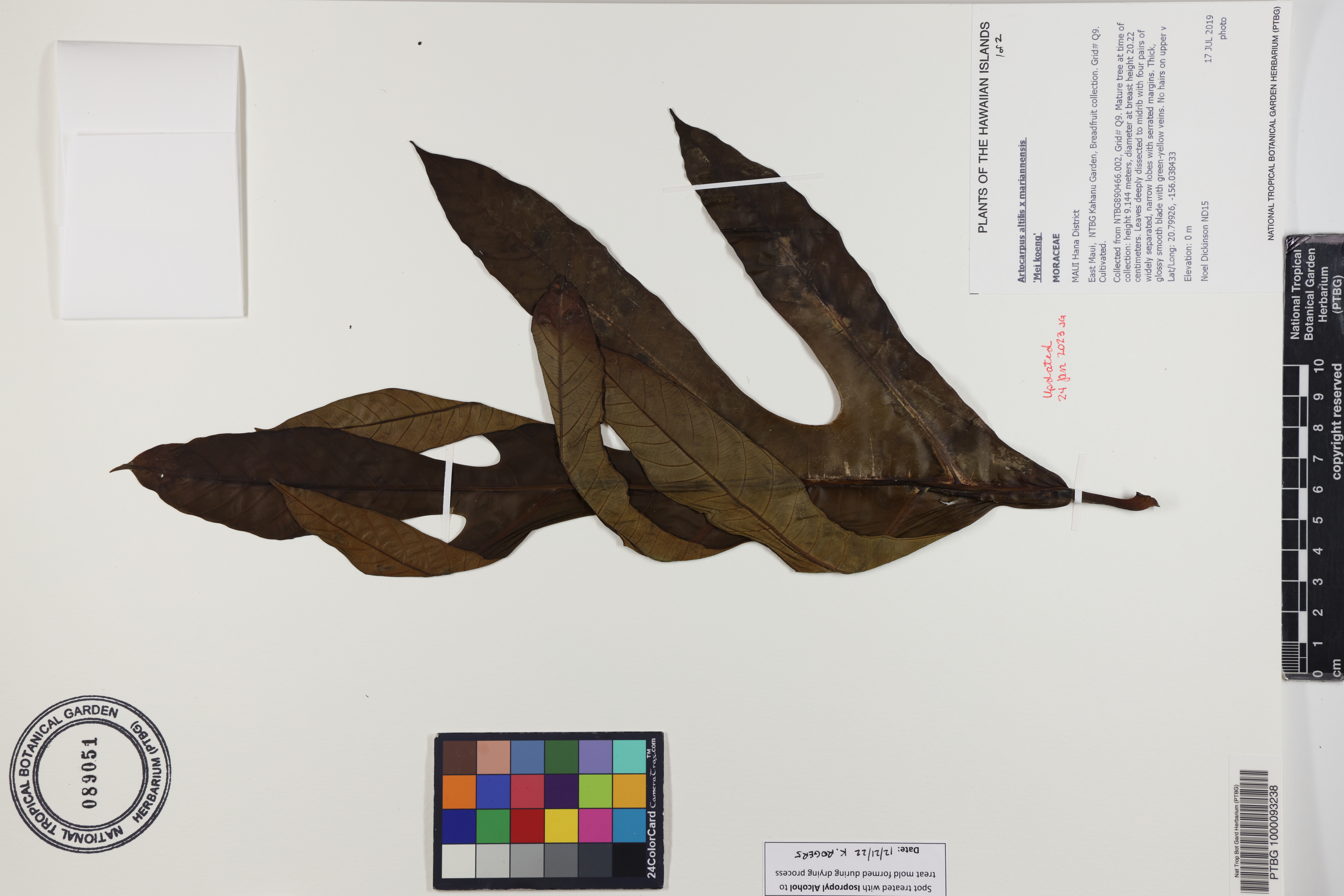 Collected from NTBG890466.002, Grid# Q9. Mature tree at time of collection: height 9.144 meters, diameter at breast height 20.22 centimeters. Leaves deeply dissected to midrib with four pairs of widely separated, narrow lobes with serrated margins. Thick, glossy smooth blade with green-yellow veins. No hairs on upper veins. Profuse appressed reddish hairs on lower veins. Name means hand or branched like coral, refers to the serrated, deeply dissected leaves. Also called Mwe serang, or Weang. Seeded breadfruit are known as Meias with two types: deeply incised leaves (Mei koeng) or entire (Mei chocho). Fruit and male flowers present (July). Refer to Collectors ID ND67.
