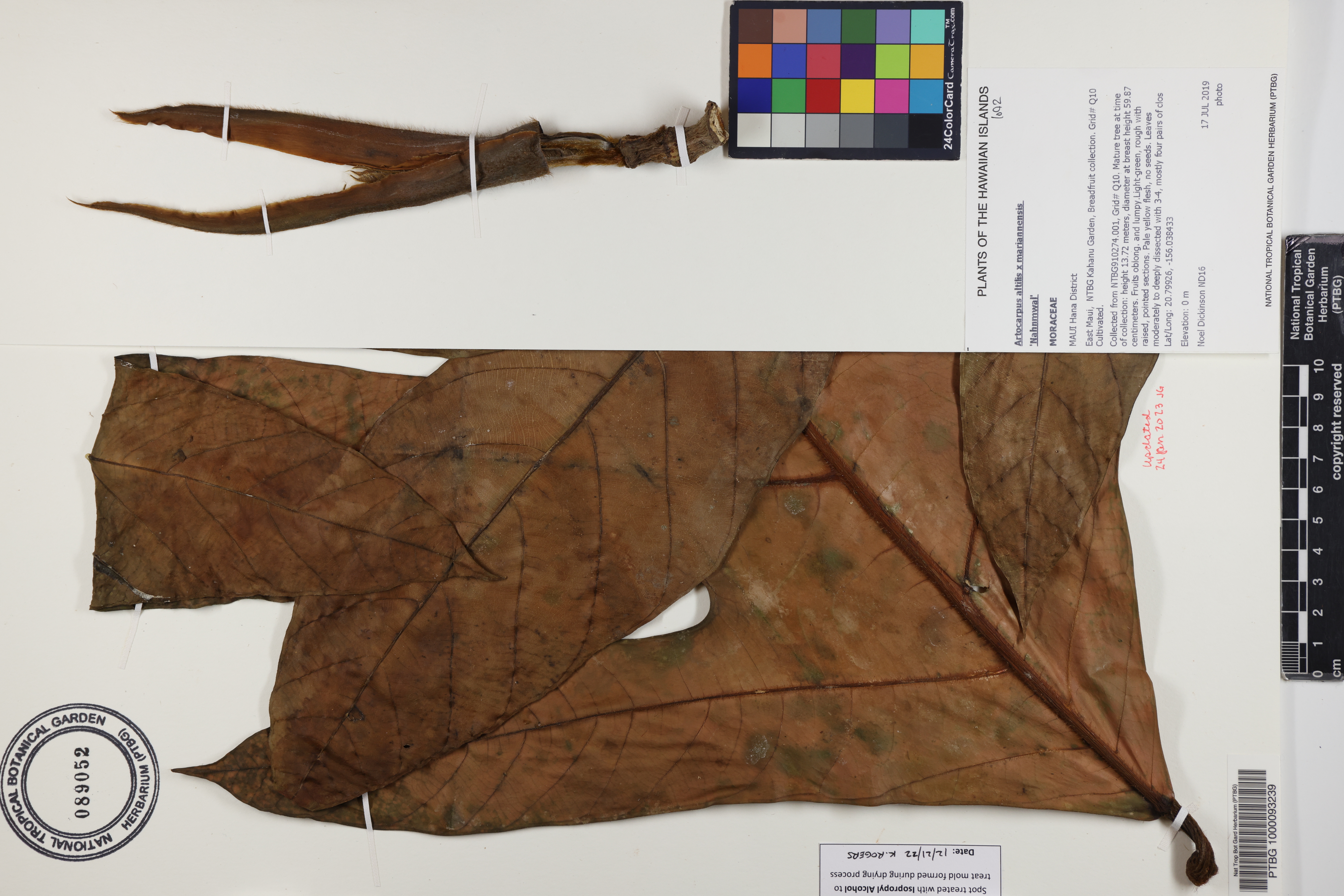 Collected from NTBG910274.001, Grid# Q10. Mature tree at time of collection: height 13.72 meters, diameter at breast height 59.87 centimeters. Fruits oblong. and lumpy.Light-green, rough with raised, pointed sections. Pale yellow flesh, no seeds. Leaves moderately to deeply dissected with 3-4, mostly four pairs of close lobes with slightly undulate margins. Very dark, soft, glossy blade with green-yellow veins. Profuse long stiff white hairs on upper veins. Underside rough. Fruit and male flowers present (July). Refer to Collectors ID ND66.