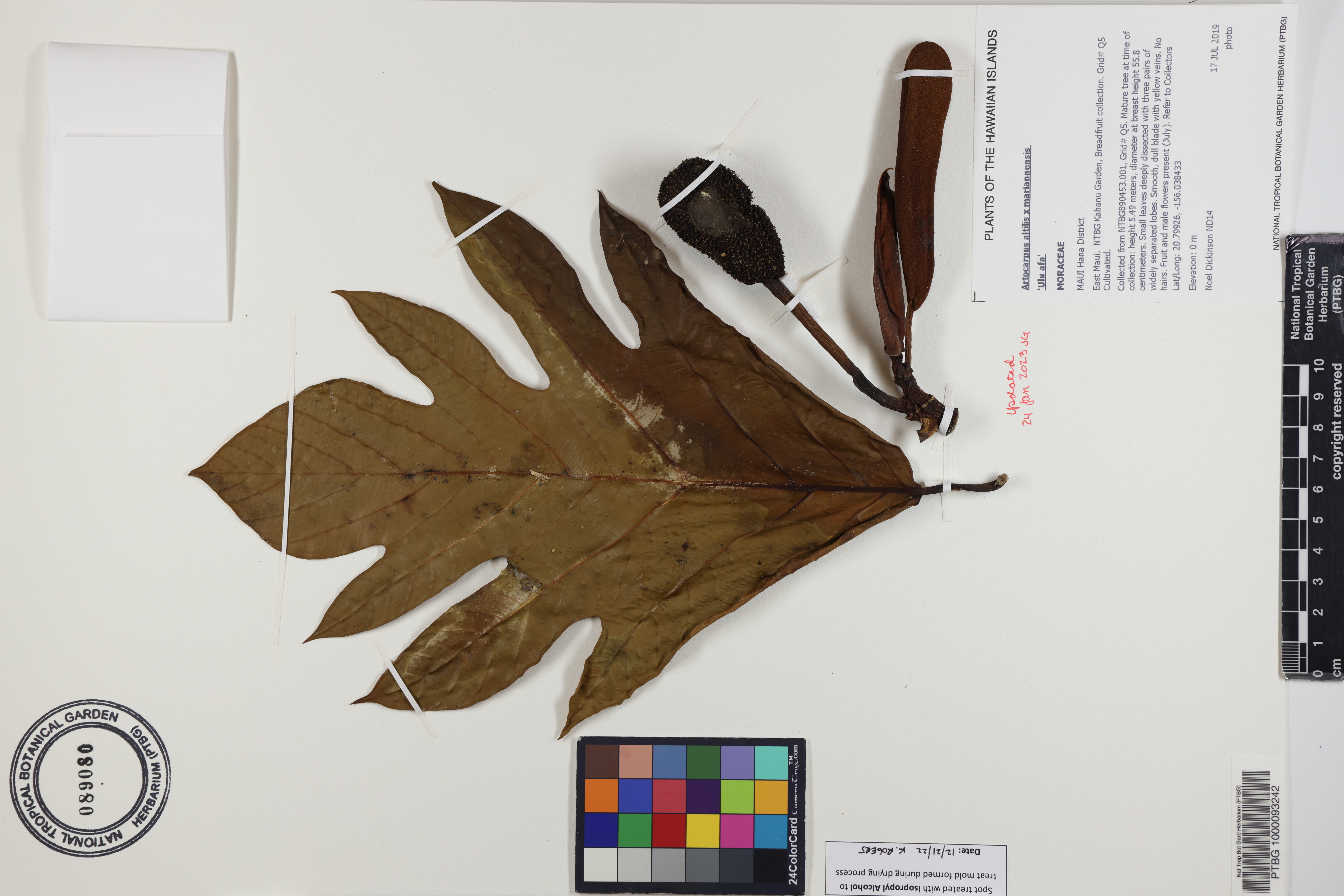 Collected from NTBG890453.001, Grid# Q5. Mature tree at time of collection: height 5.49 meters, diameter at breast height 55.8 centimeters. Small leaves deeply dissected with three pairs of widely separated lobes. Smooth, dull blade with yellow veins. No hairs. Fruit and male flowers present (July). Refer to Collectors ID ND69.