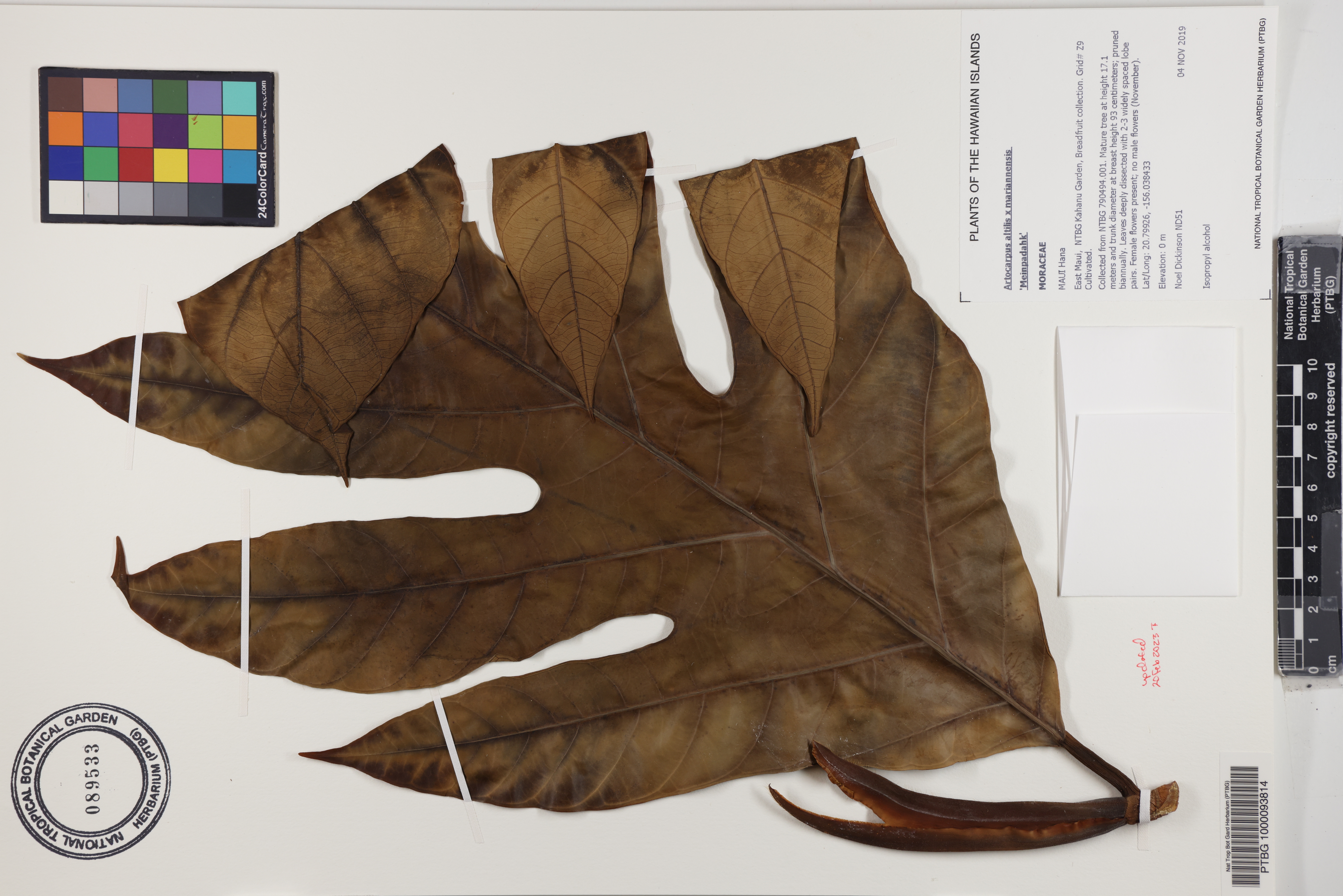 Collected from NTBG 790494.001. Mature tree at height 17.1 meters and trunk diameter at breast height 93 centimeters; pruned biannually. Leaves deeply dissected with 2-3 widely spaced lobe pairs. Female flowers present; no male flowers (November).