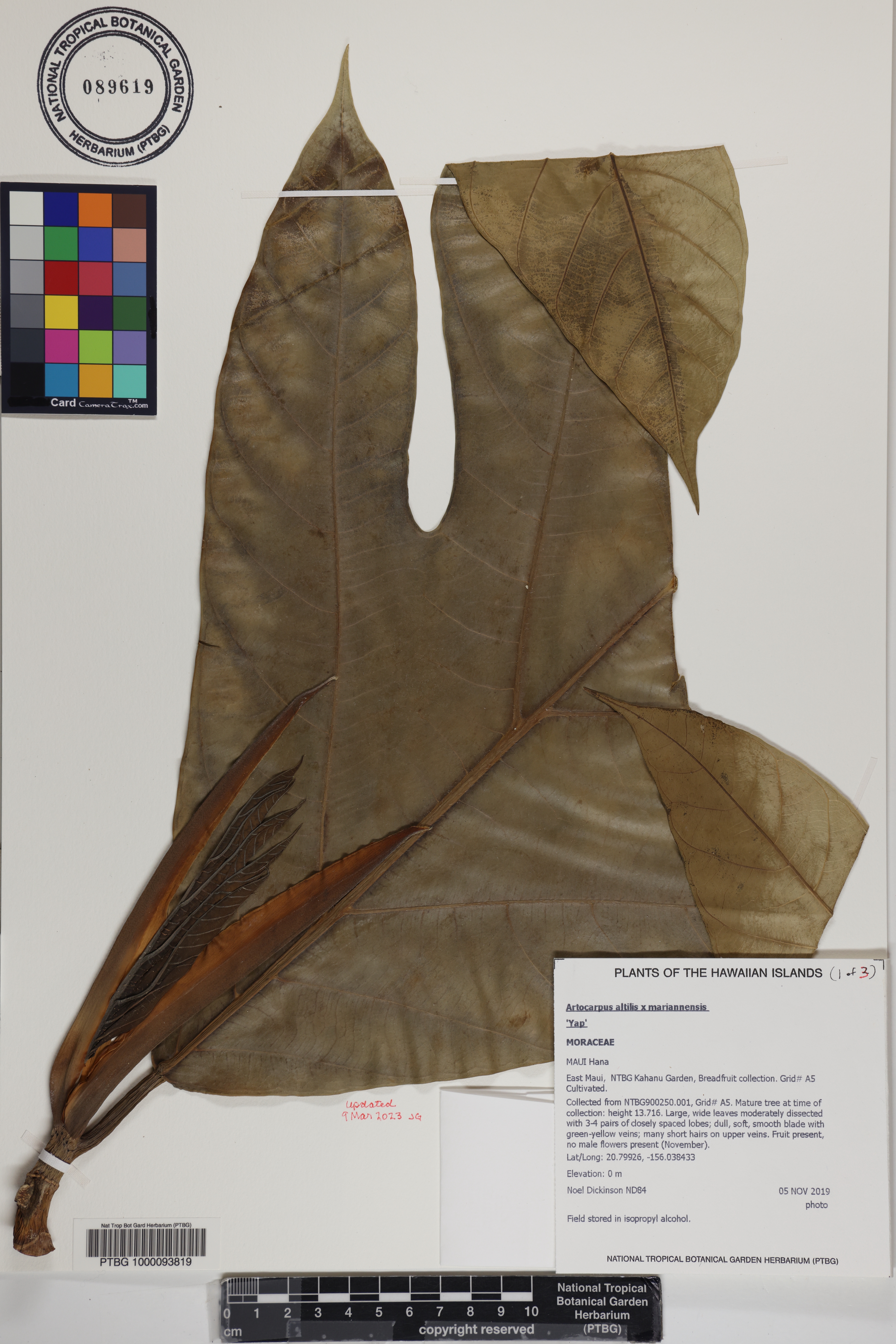 Collected from NTBG900250.001, Grid# A5. Mature tree at time of collection: height 13.716. Large, wide leaves moderately dissected with 3-4 pairs of closely spaced lobes; dull, soft, smooth blade with green-yellow veins; many short hairs on upper veins. Fruit present, no male flowers present (November).