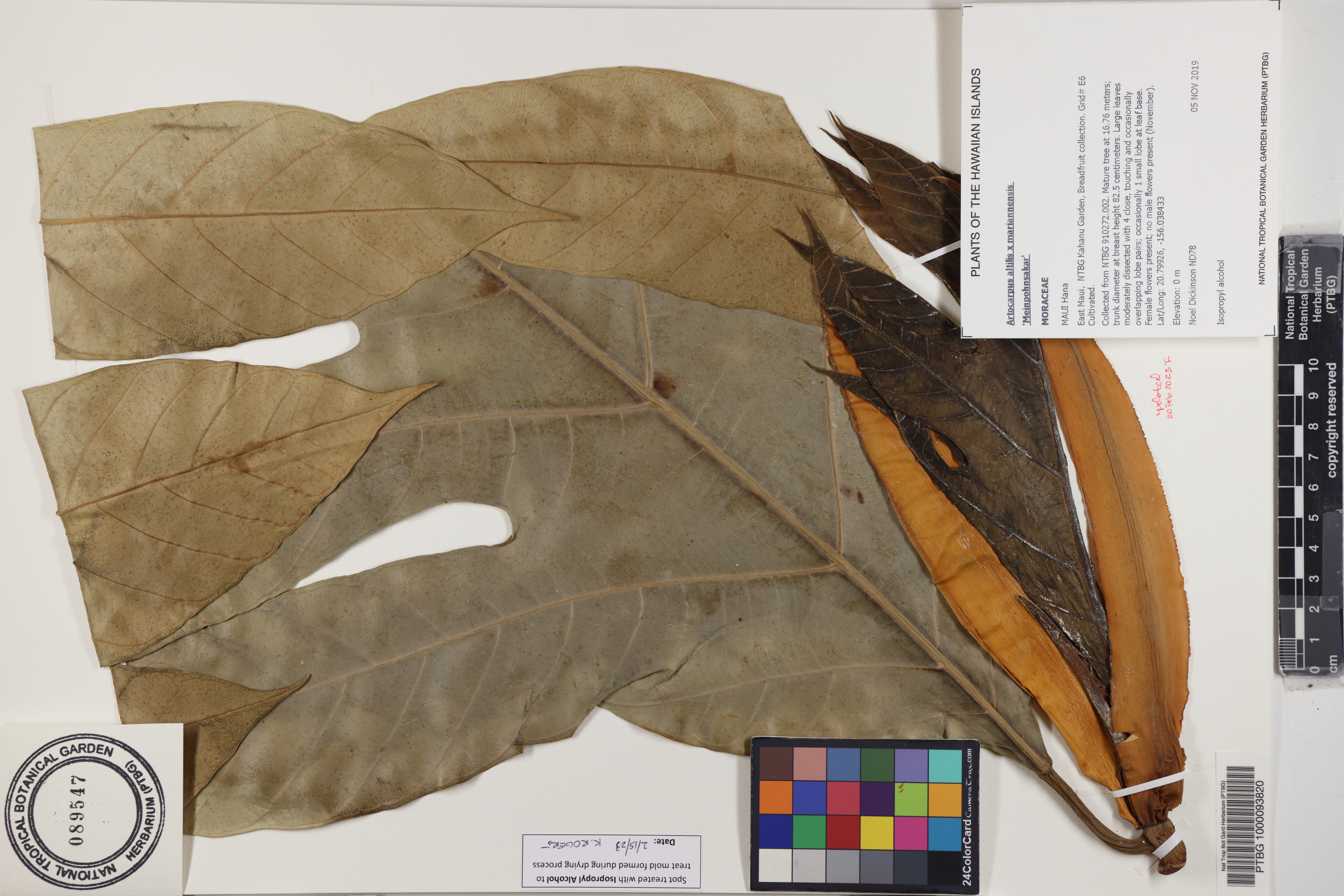 Collected from NTBG 910272.002. Mature tree at 16.76 meters; trunk diameter at breast height 82.5 centimeters. Large leaves moderately dissected with 4 close, touching and occasionally overlapping lobe pairs; occasionally 1 small lobe at leaf base. Female flowers present; no male flowers present (November).