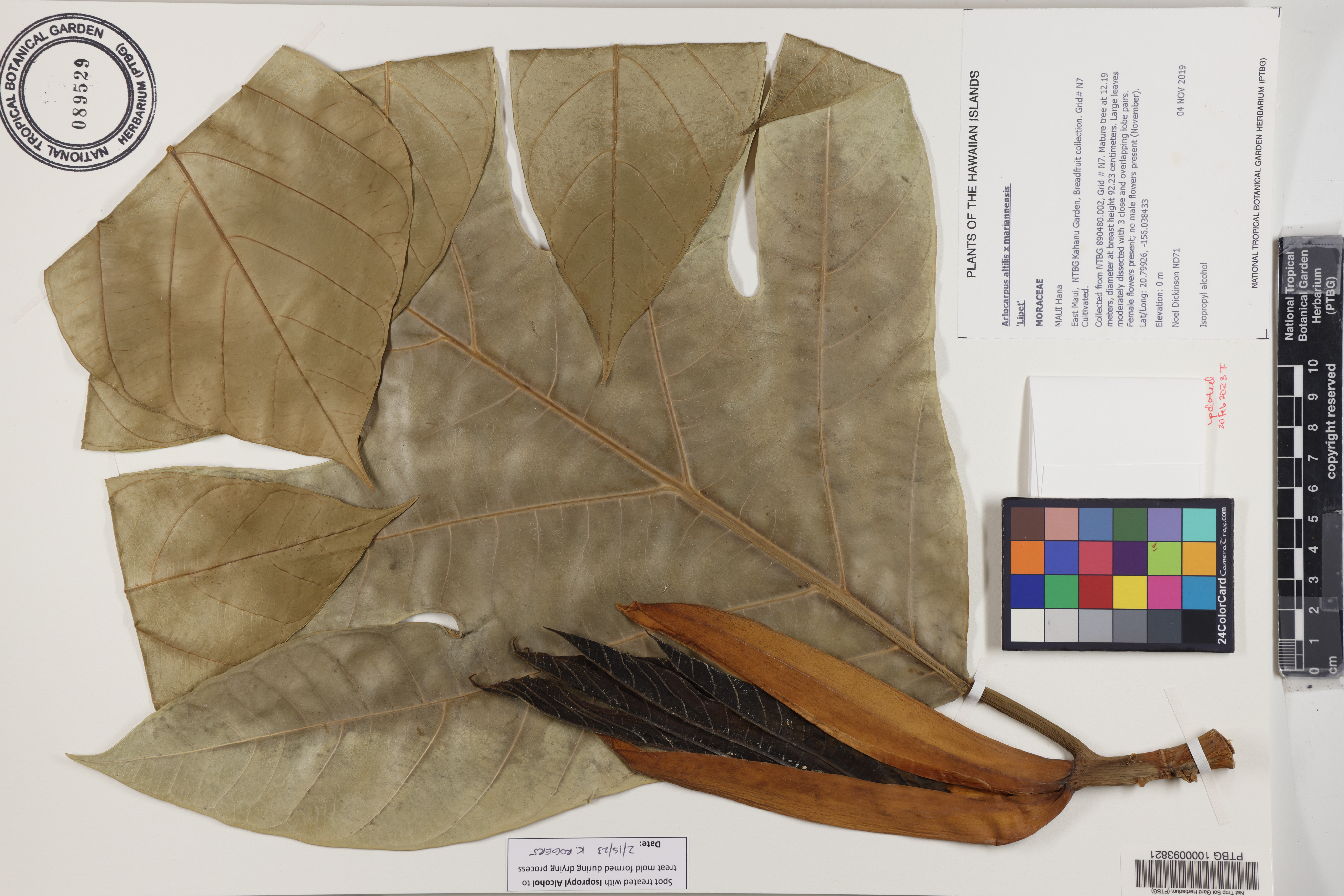 Collected from NTBG 890480.002, Grid # N7. Mature tree at 12.19 meters, diameter at breast height 92.23 centimeters. Large leaves moderately dissected with 3 close and overlapping lobe pairs. Female flowers present; no male flowers present (November).