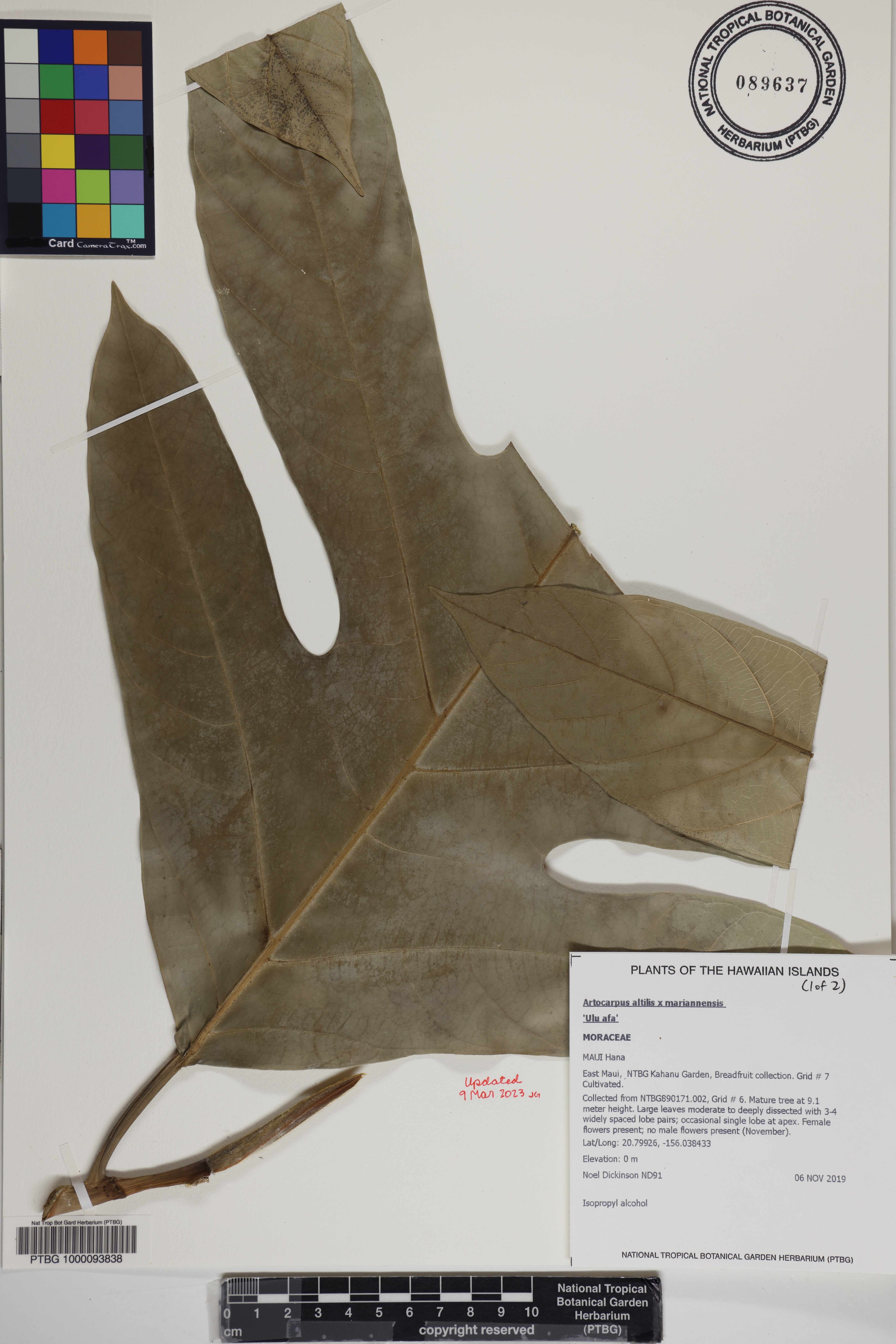Collected from NTBG890171.002, Grid # 6. Mature tree at 9.1 meter height. Large leaves moderate to deeply dissected with 3-4 widely spaced lobe pairs; occasional single lobe at apex. Female flowers present; no male flowers present (November).