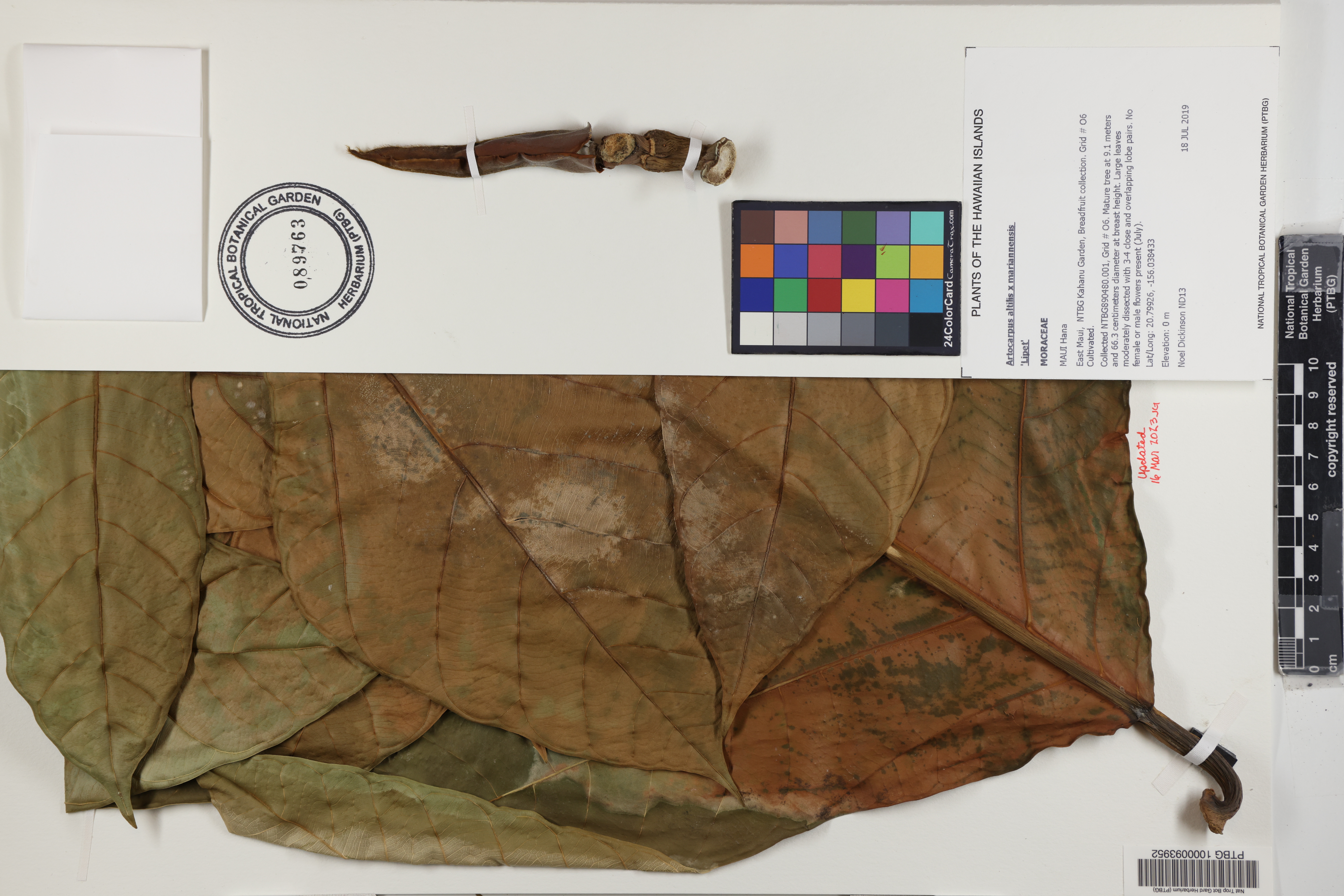 Collected NTBG890480.001, Grid # O6. Mature tree at 9.1 meters and 66.3 centimeters diameter at breast height. Large leaves moderately dissected with 3-4 close and overlapping lobe pairs. No female or male flowers present (July).