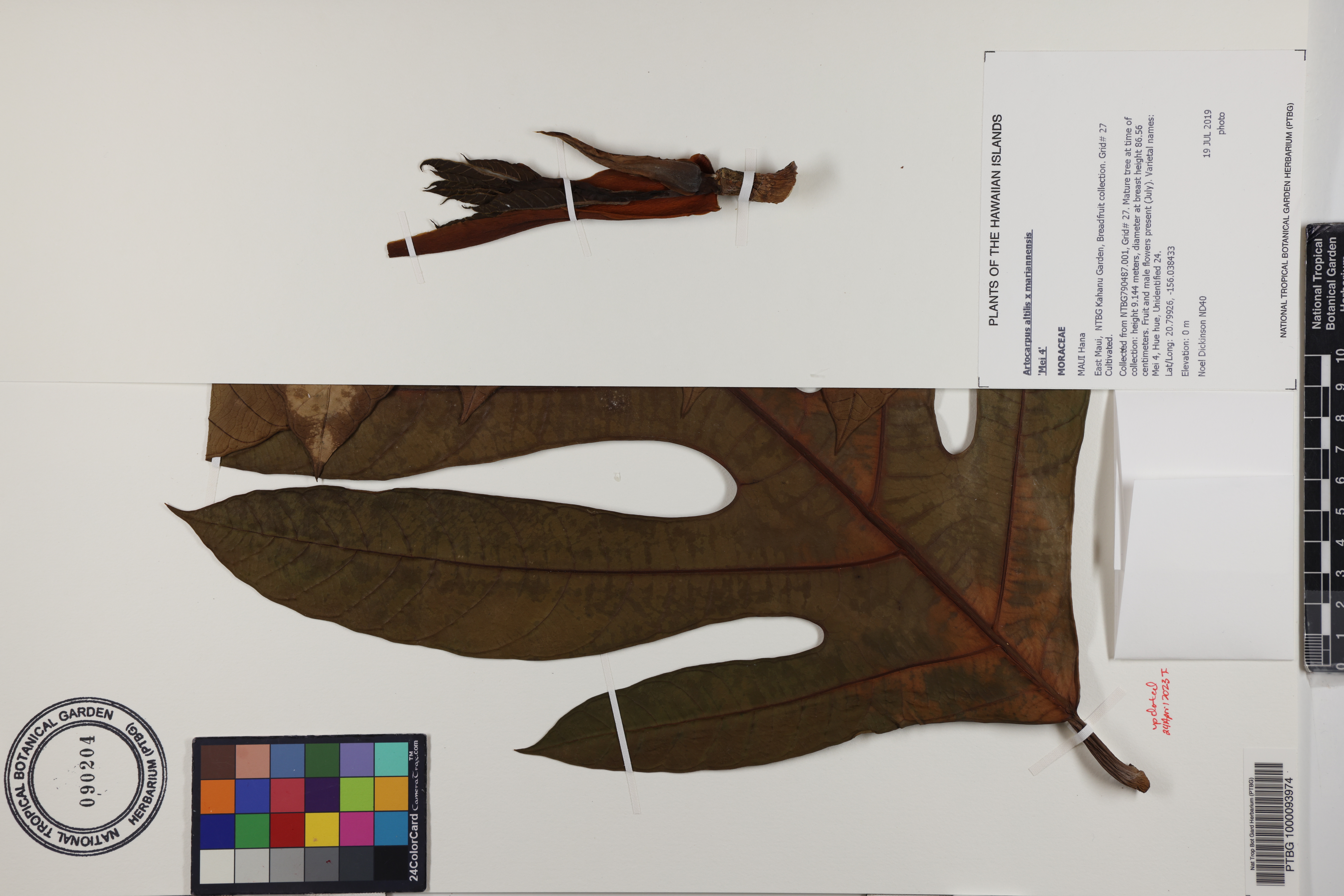 Collected from NTBG790487.001, Grid# 27. Mature tree at time of collection: height 9.144 meters, diameter at breast height 86.56 centimeters. Fruit and male flowers present (July). Varietal names: Mei 4, Hue hue, Unidentified 24.