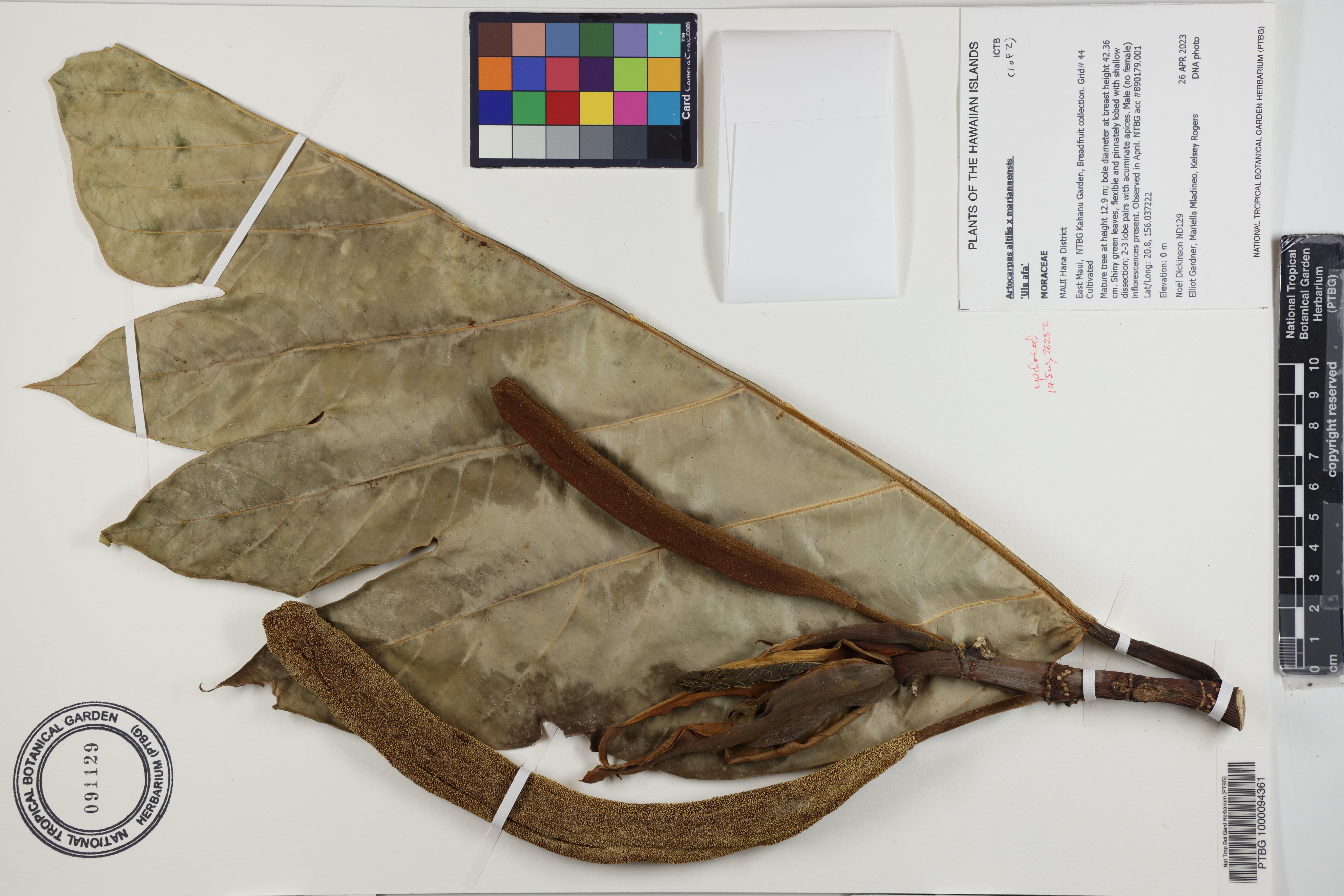 Mature tree at height 12.9 m; bole diameter at breast height 42.36 cm. Shiny green leaves, flexible and pinnately lobed with shallow dissection; 2-3 lobe pairs with acuminate apices. Male (no female) inflorescences present. . NTBG acc #890179.001