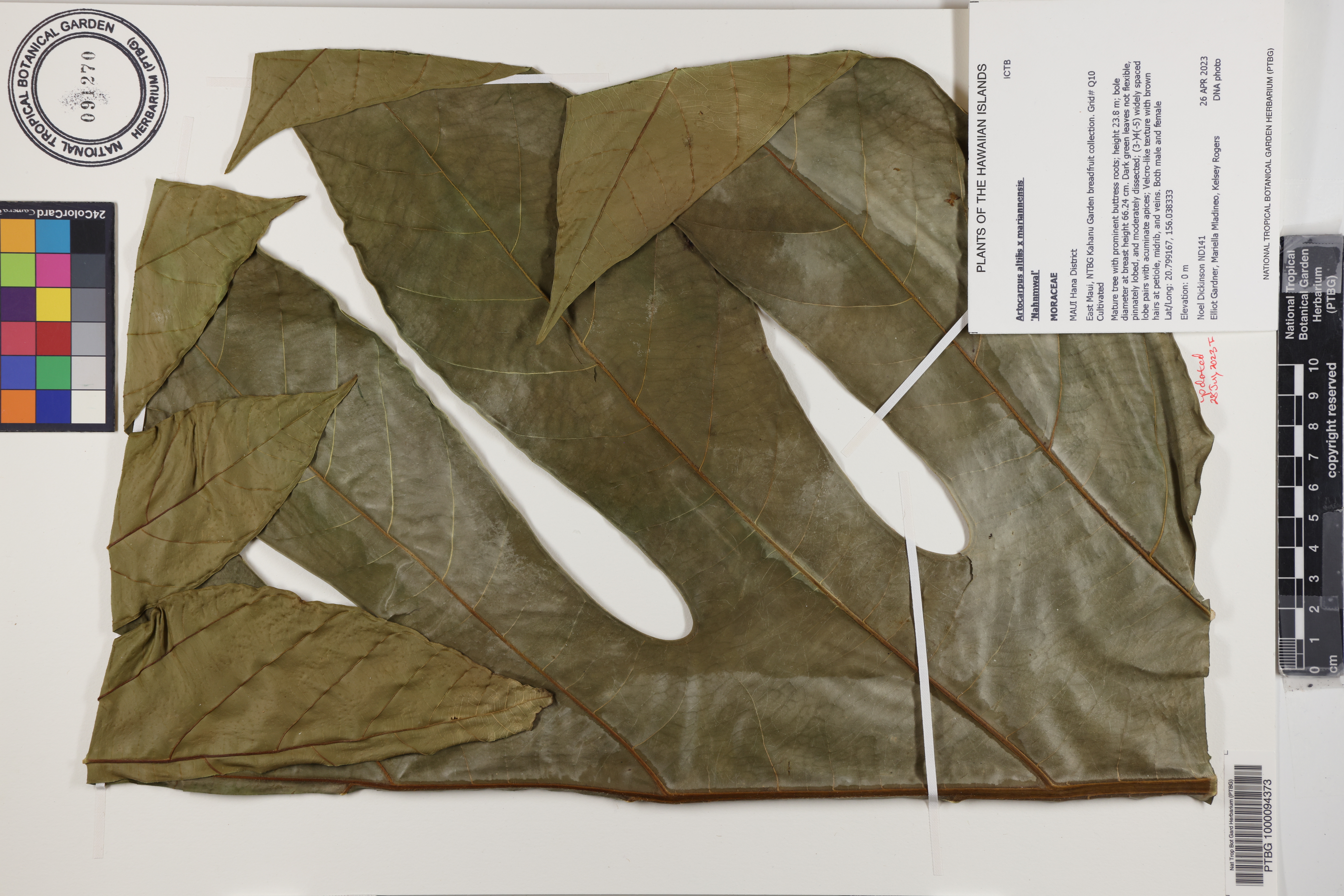 Mature tree with prominent buttress roots; height 23.8 m; bole diameter at breast height 66.24 cm. Dark green leaves not flexible, pinnately lobed, and moderately dissected; (3-)4(-5) widely spaced lobe pairs with acuminate apices; Velcro-like texture with brown hairs at petiole, midrib, and veins. Both male and female inflorescences present; more than 20 immature fruit. NTBG acc #910274.001