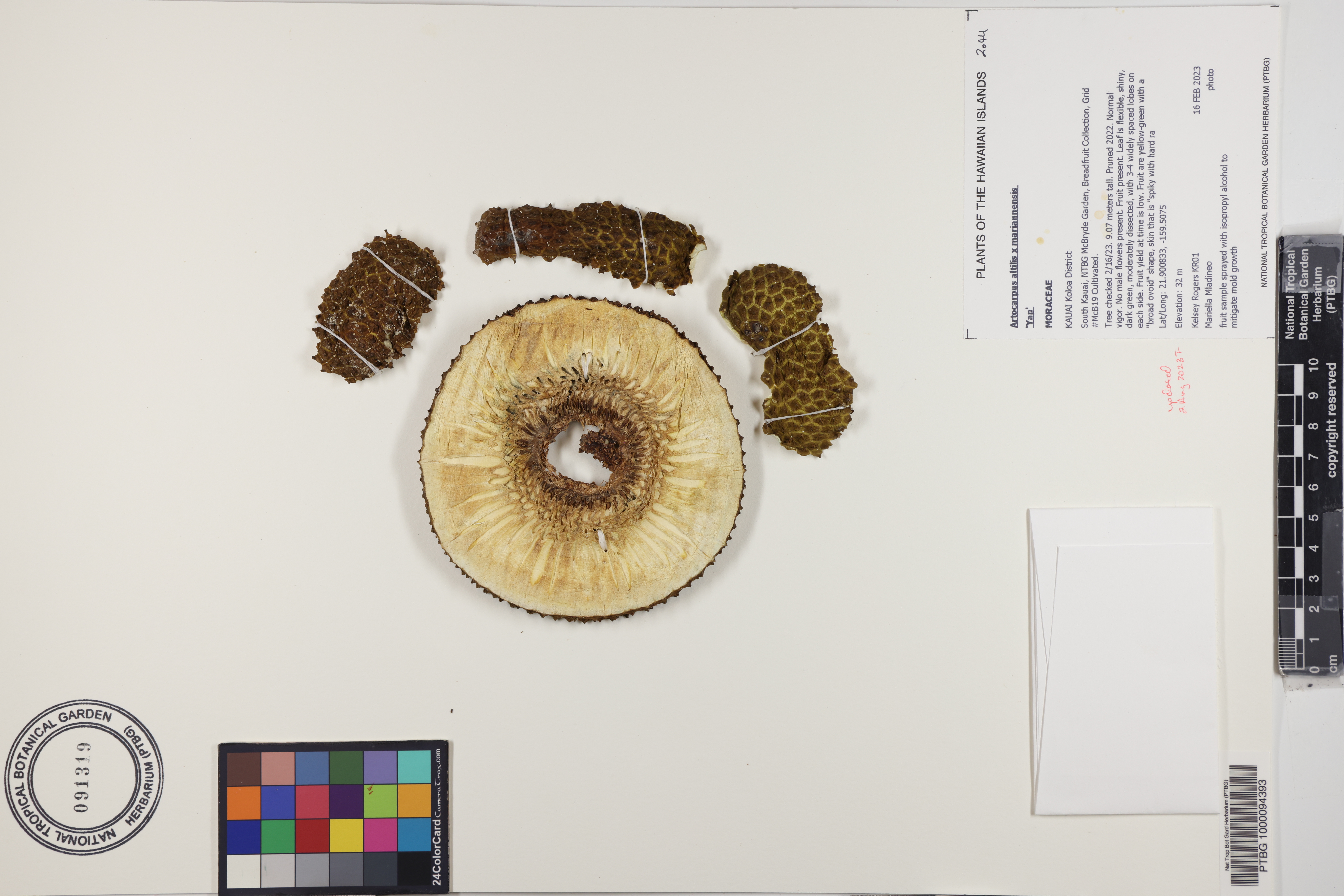 Tree checked 2/16/23. 9.07 meters tall. Pruned 2022. Normal vigor. No male flowers present. Fruit present. Leaf is flexible, shiny, dark green, moderately dissected, with 3-4 widely spaced lobes on each side. Fruit yield at time is low. Fruit are yellow-green with a "broad ovoid" shape, skin that is "spiky with hard raised center point", and flesh that is yellow. Tiny hairs present on lower and upper leaf veins. NTBG acc. #030045.001