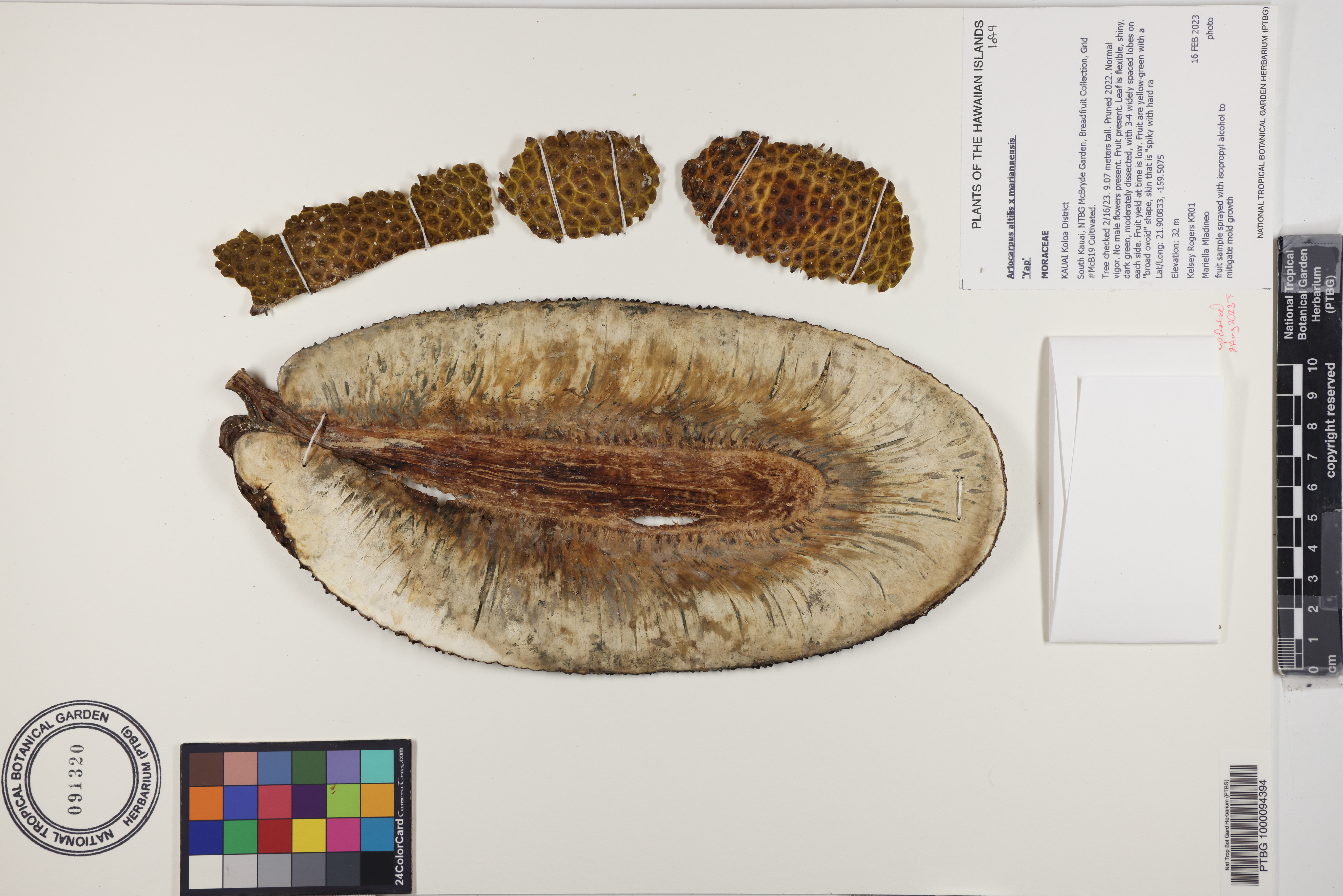 Tree checked 2/16/23. 9.07 meters tall. Pruned 2022. Normal vigor. No male flowers present. Fruit present. Leaf is flexible, shiny, dark green, moderately dissected, with 3-4 widely spaced lobes on each side. Fruit yield at time is low. Fruit are yellow-green with a "broad ovoid" shape, skin that is "spiky with hard raised center point", and flesh that is yellow. Tiny hairs present on lower and upper leaf veins. NTBG acc. #030045.001