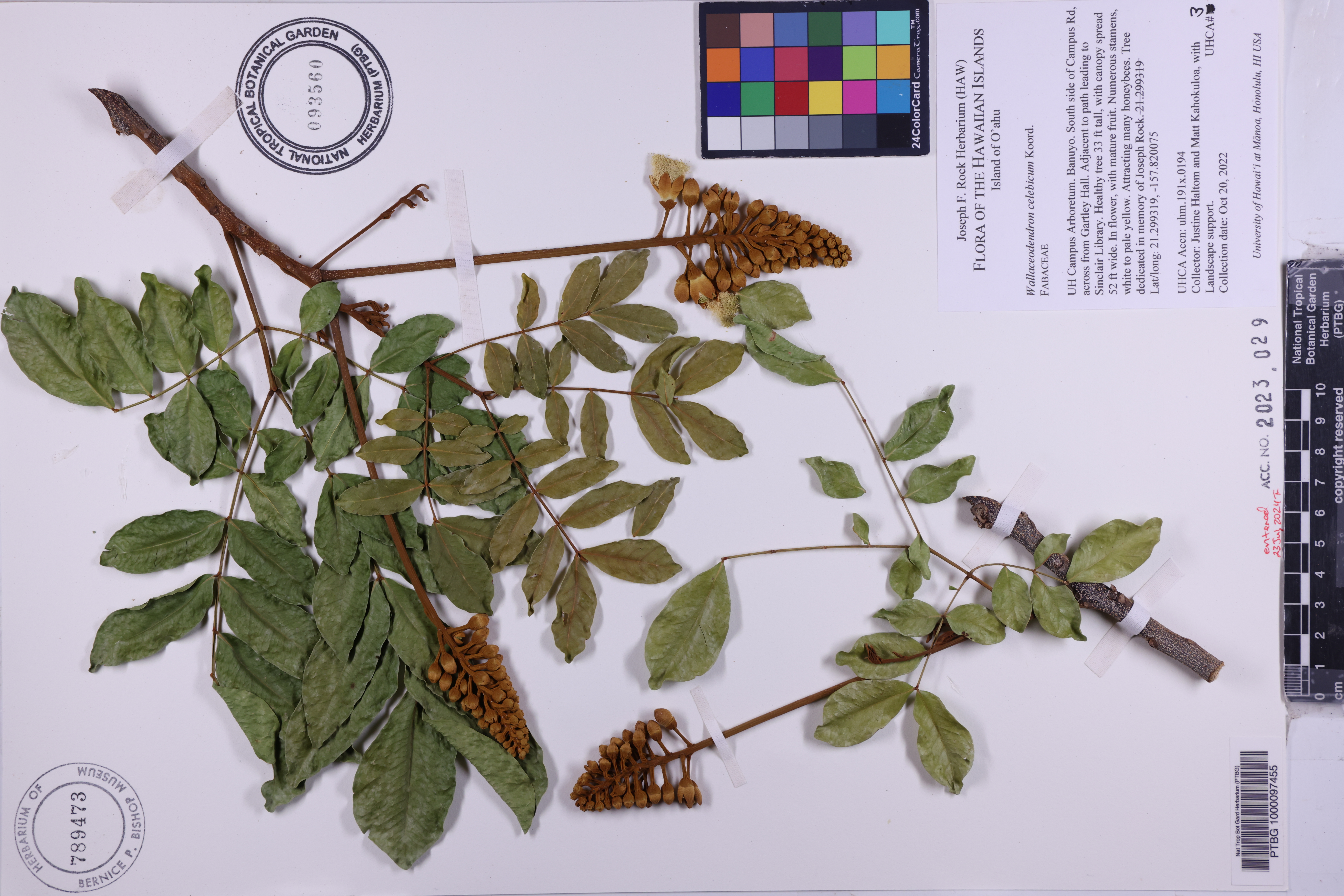 Healthy tree 33 ft tall, with canopy spread 52 ft wide. In flower, with mature fruit. Numerous stamens, with to pale yellow. Attracting many honeybees. Tree dedicated in memory of Joseph Rock. UHCA Accn: uhm.191x.0194