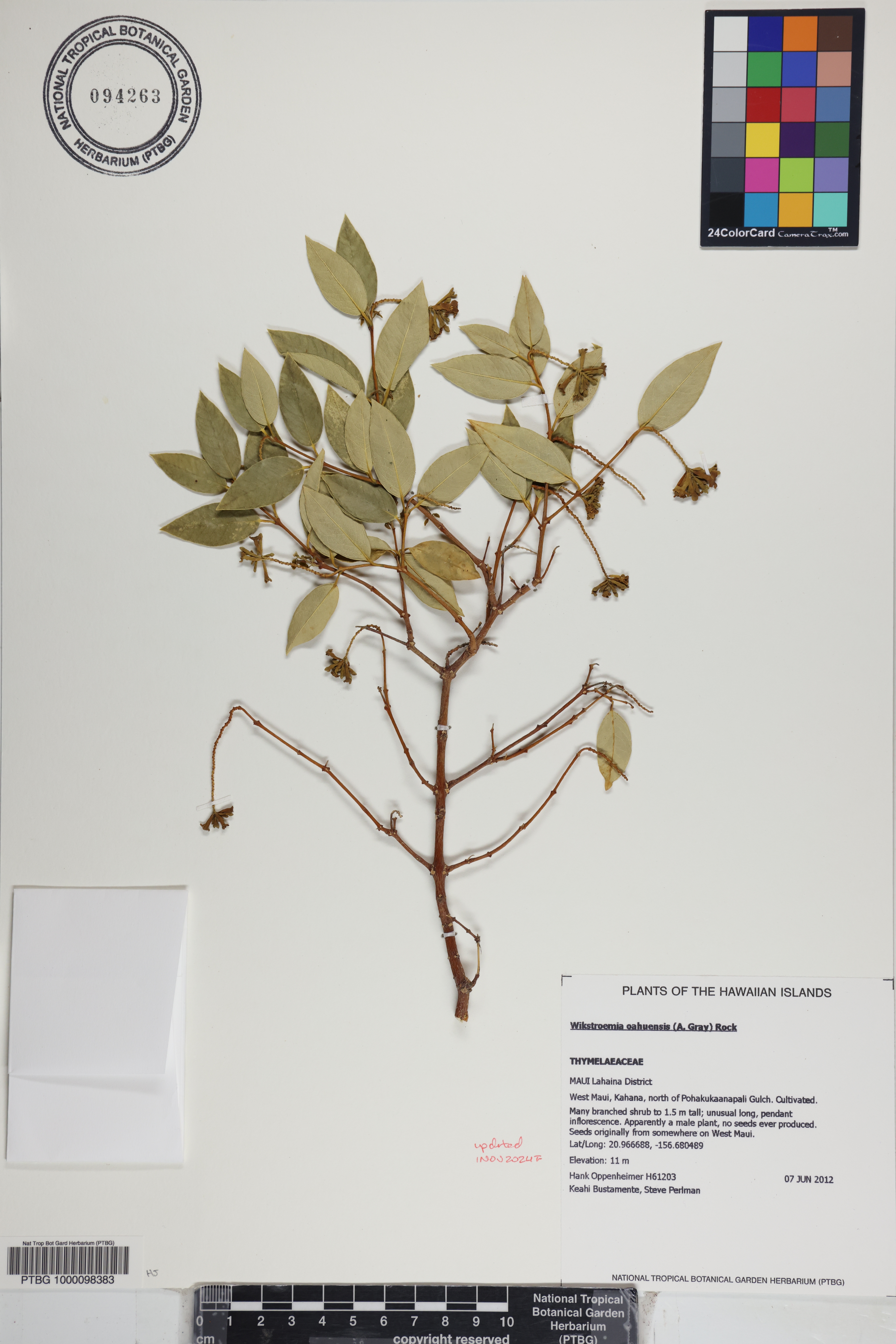 Many branched shrub to 1.5 m tall; unusual long, pendant inflorescence. Apparently a male plant, no seeds ever produced. Seeds originally from somewhere on West Maui.