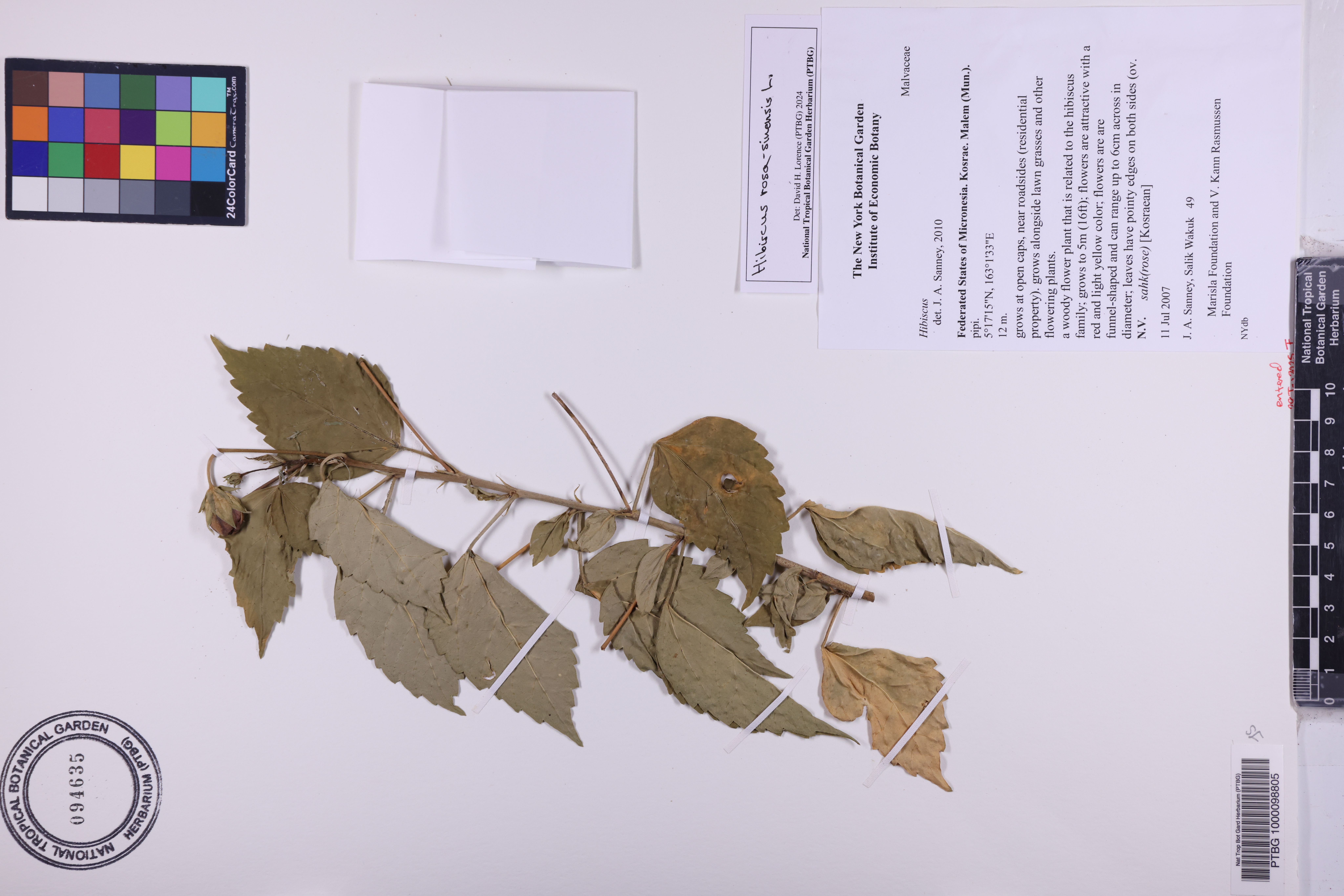 A woody flower plant that is related to the hibiscus family; grows to 5m (16 ft); flowers are attractive with a red and light yellow color; flowers are funnel-shaped and can range up to 6cm across in diameter; leaves have pointy edges on both sides (ov. N.V. sahk(rose) [Kosraean] Grows at open gaps, near roadsides (residential property). grows alongside lawn grasses and other flowering plants.