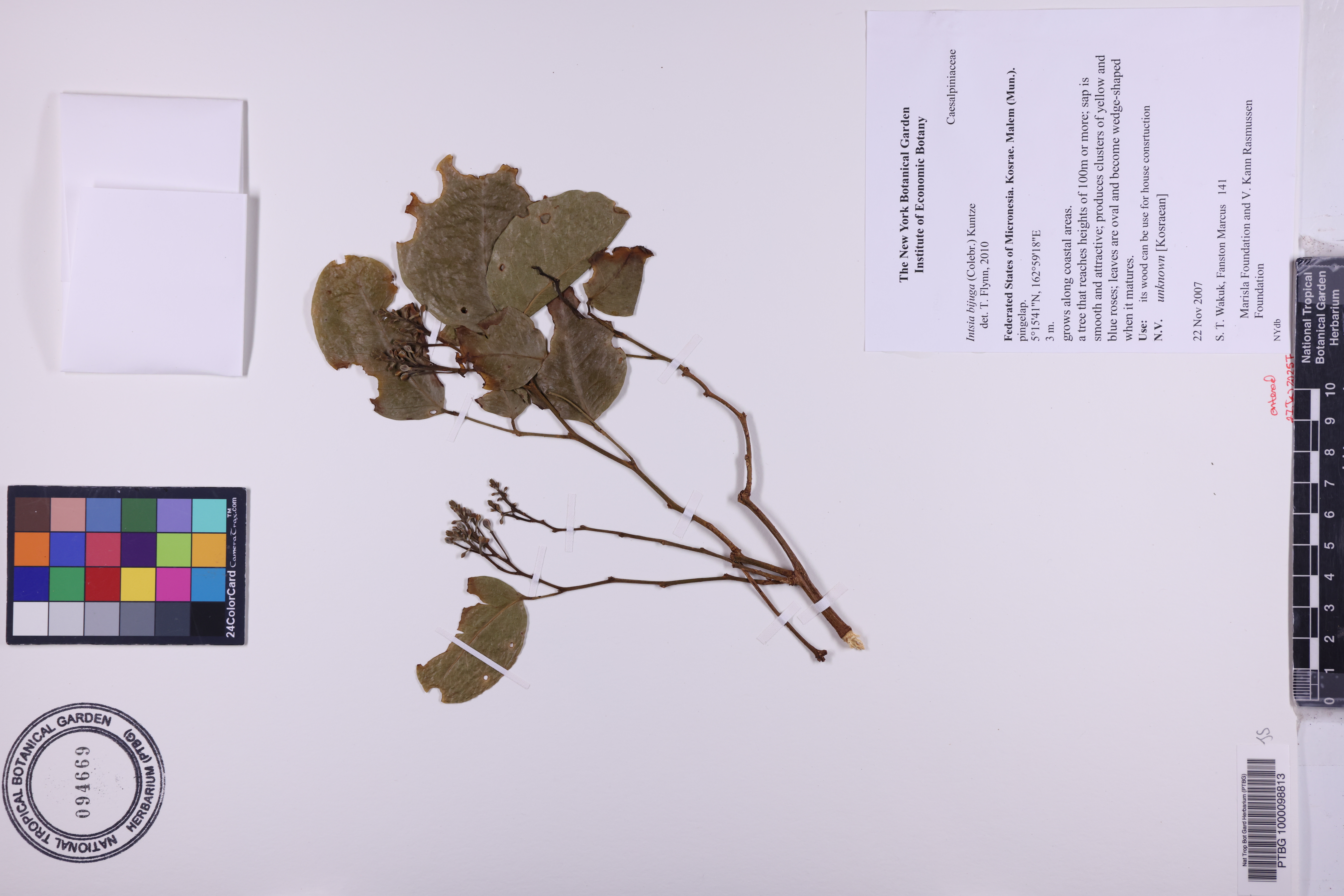 A tree that reaches heights of 100m or more; sap is smooth and attractive; produces clusters of yellow and blue roses; leaves are oval and become wedge-shaped when it matures. N.V. unknown [Kosraean]