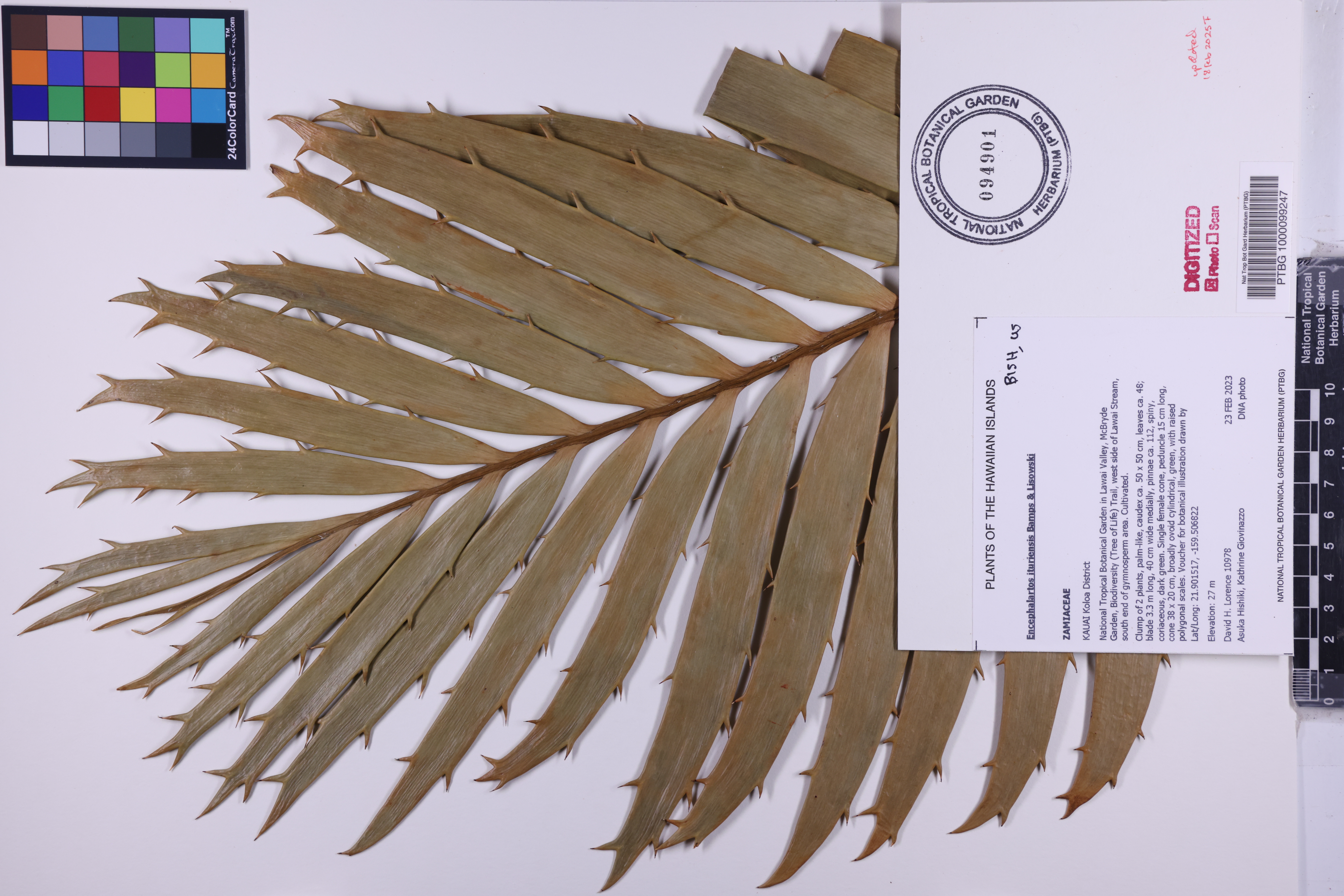 Clump of 2 plants, palm-like, caudex ca. 50 x 50 cm, leaves ca. 48; blade 3.3 m long, 40 cm wide medially, pinnae ca. 112, spiny, coriaceous, dark green. Single female cone, peduncle 15 cm long, cone 38 x 20 cm, broadly ovoid cylindrical, green, with raised polygonal scales. Voucher for botanical illustration drawn by Kathrine Giovinazzo.