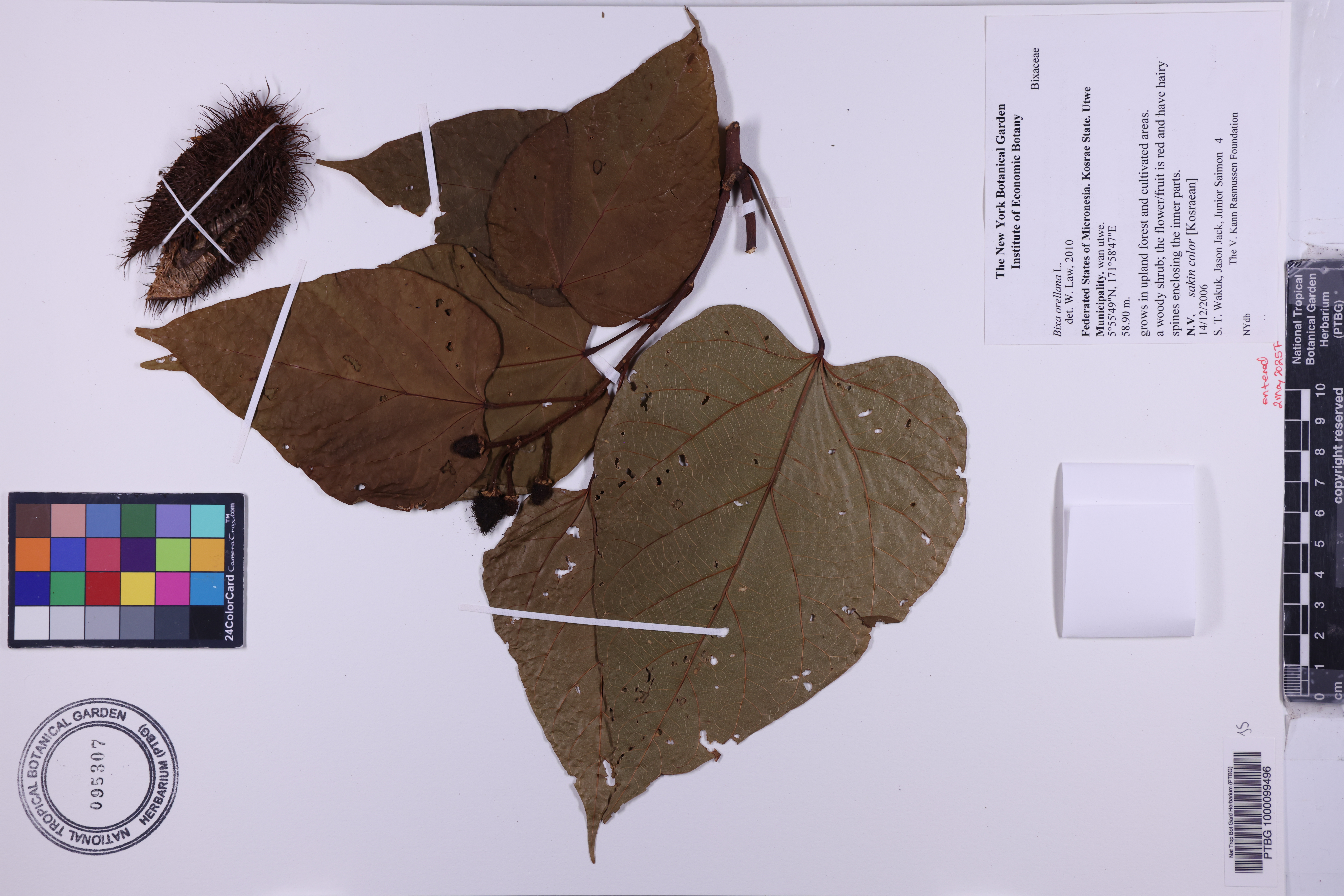 A woody shrub; the flower/fruit is red and have hairy spines enclosing the inner parts. N.V. sakin color [Kosraean]