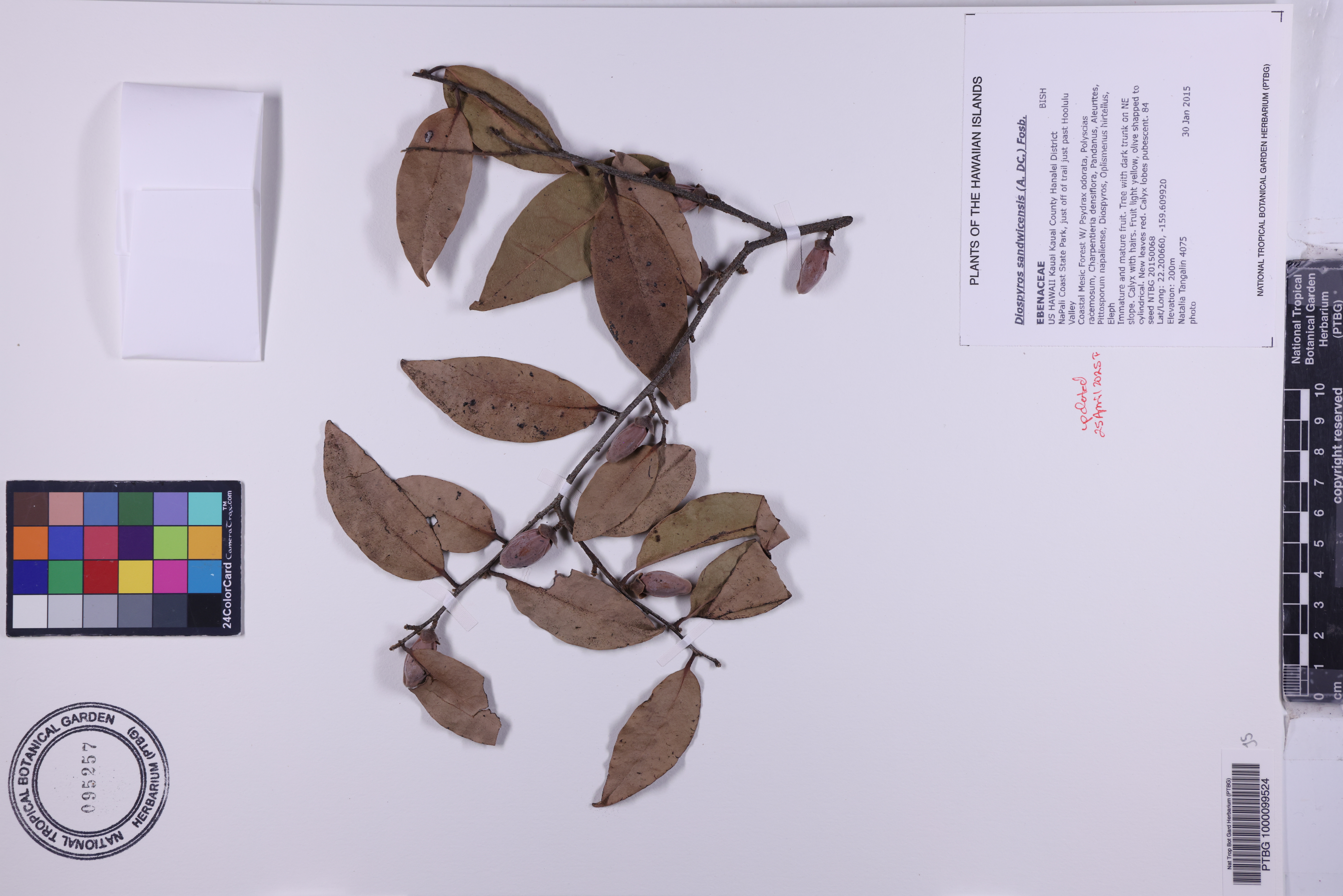Immature and mature fruit. Tree with dark trunk on NE slope. Calyx with hairs. Fruit light yellow, olive shapped to cylindrical. New leaves red. Calyx lobes pubescent. 84 seed NTBG 20150068