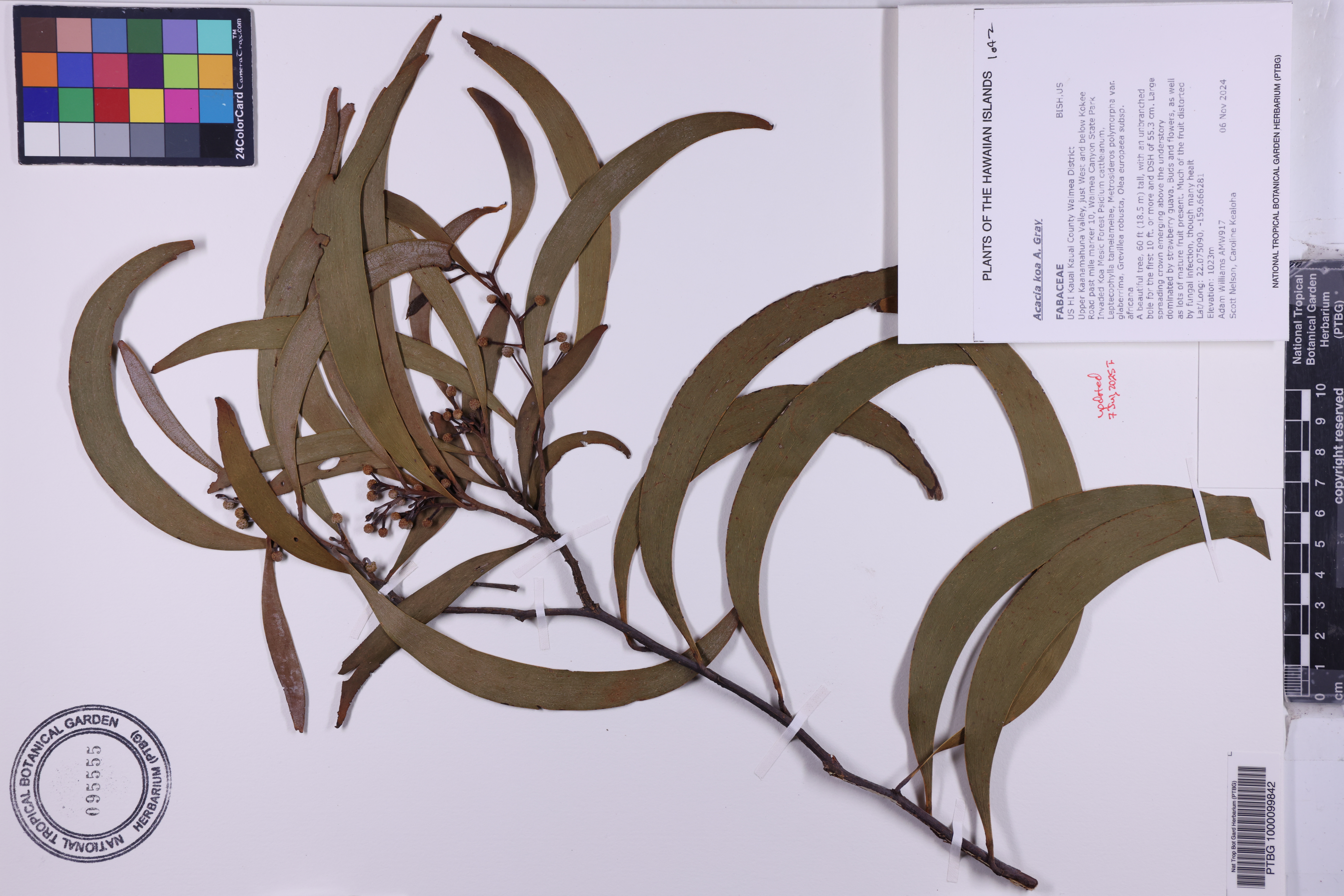 A beautiful tree, 60 ft (18.5 m) tall, with an unbranched bole for the first 10 ft. or more and DSH of 55.3 cm. Large spreading crown emerging above the understory dominated by strawberry guava. Buds and flowers, as well as lots of mature fruit present. Much of the fruit distorted by fungal infection, though many healthy seeds remain. Tree climbed to collect seeds for the KDOFAW seed bank and to screen for wilt resistance by HARC.