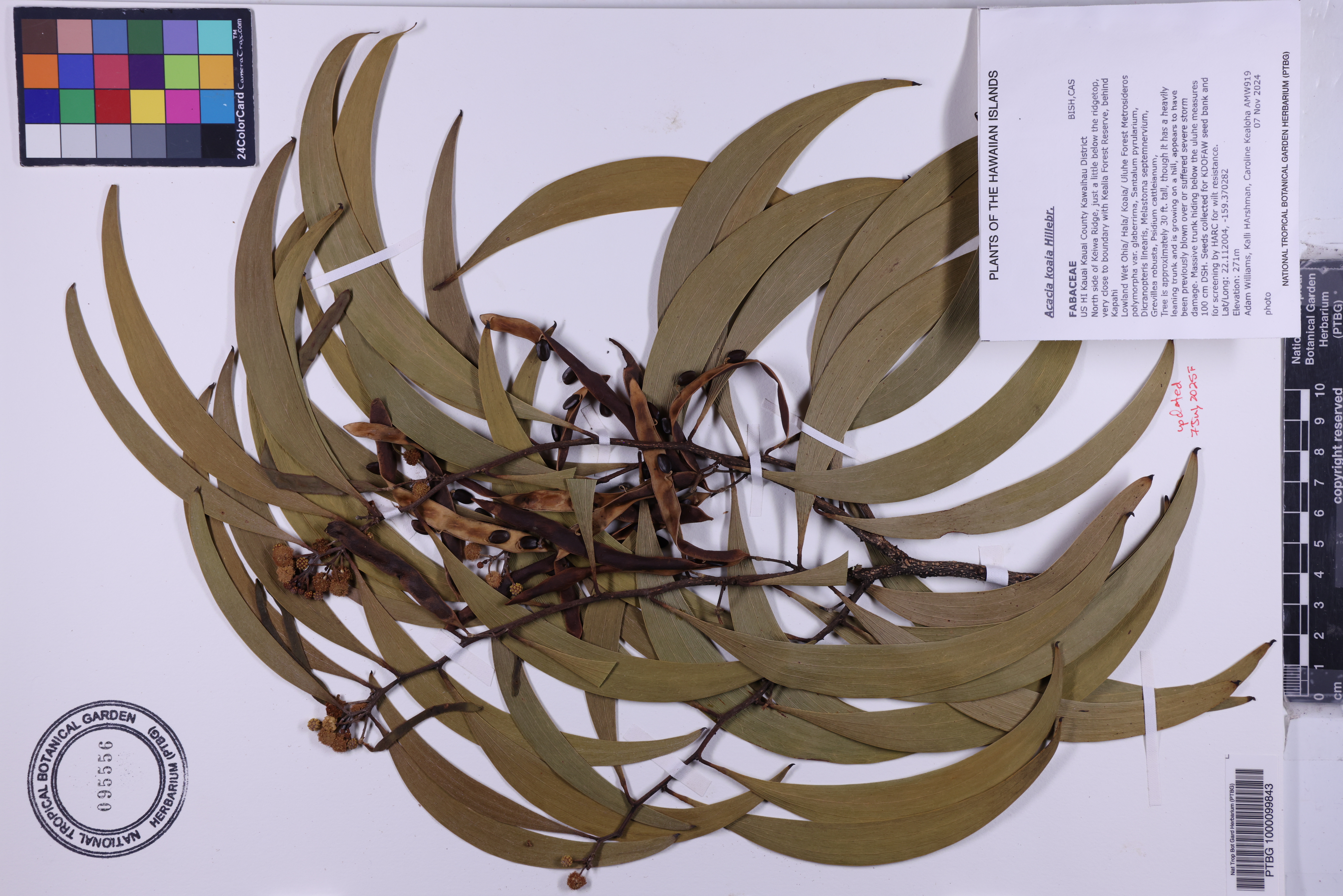 Tree is approximately 30 ft. tall, though it has a heavily leaning trunk and is growing on a hill, appears to have been previously blown over or suffered severe storm damage. Massive trunk hiding below the uluhe measures 100 cm DSH. Seeds collected for KDOFAW seed bank and for screening by HARC for wilt resistance.