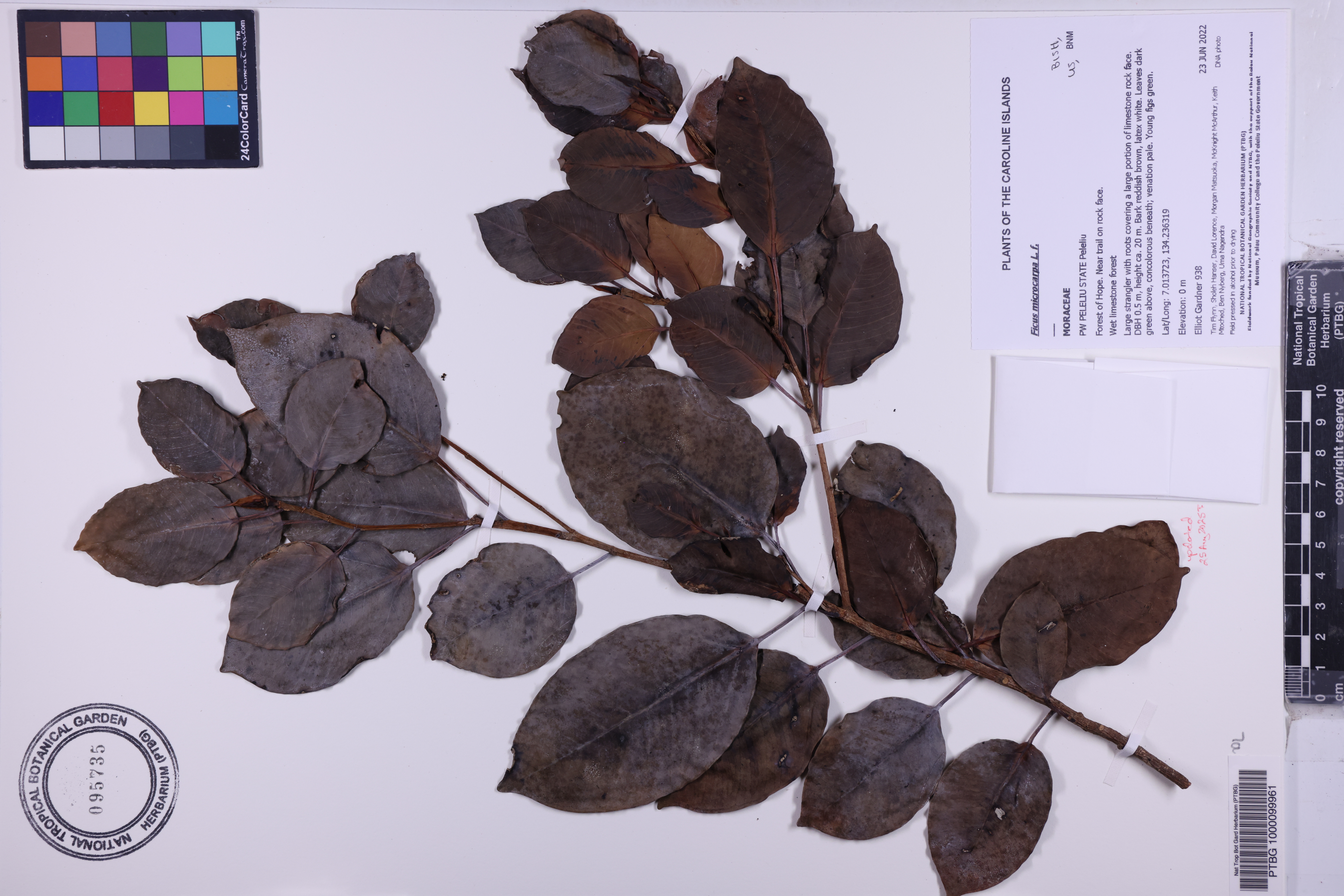 Large strangler with roots covering a large portion of limestone rock face. DBH 0.5 m, height ca. 20 m. Bark reddish brown, latex white. Leaves dark green above, concolorous beneath; venation pale. Young figs green.