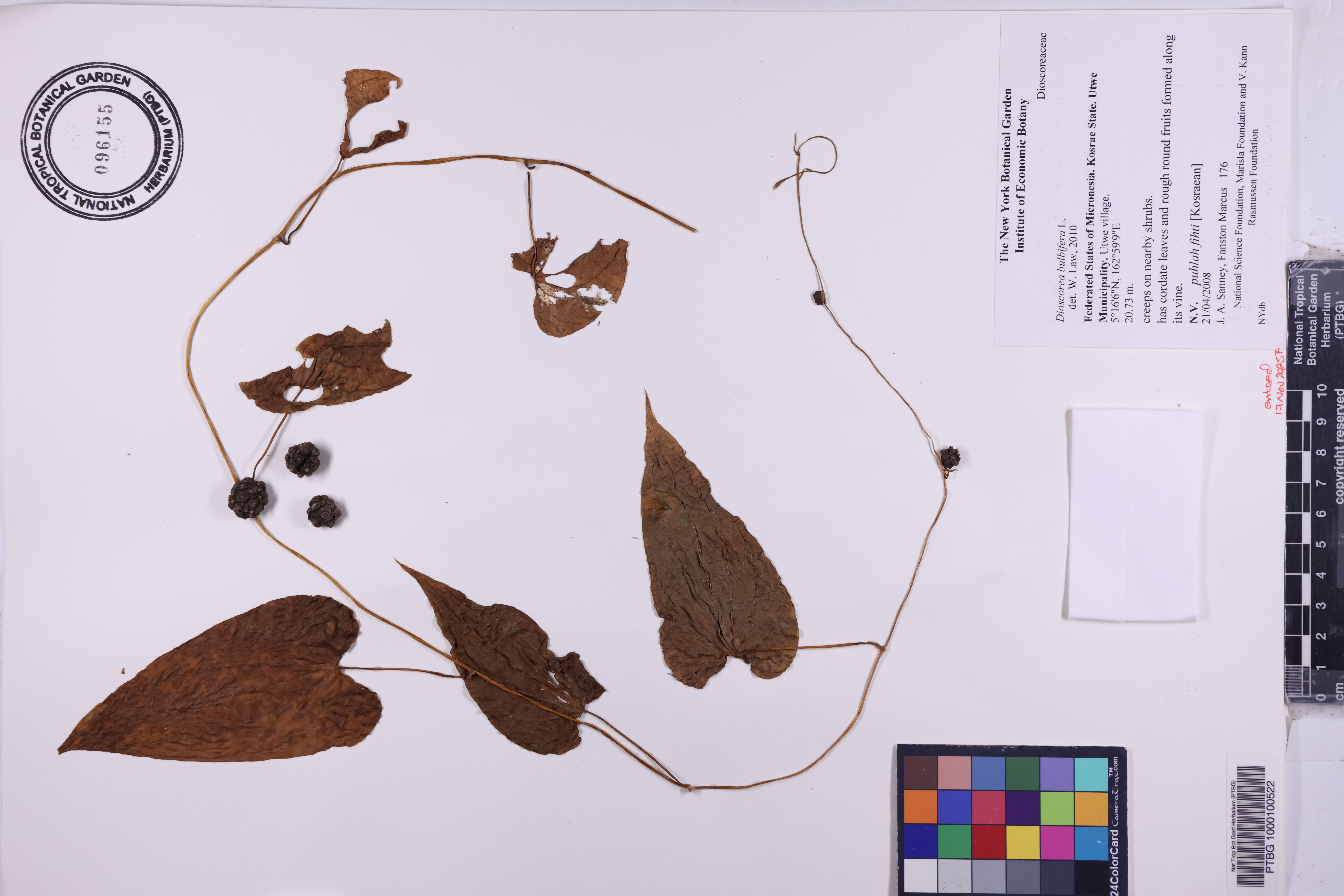 Creeps on nearby shrubs. Has cordate leaves and rough round fruits formed along its vine.