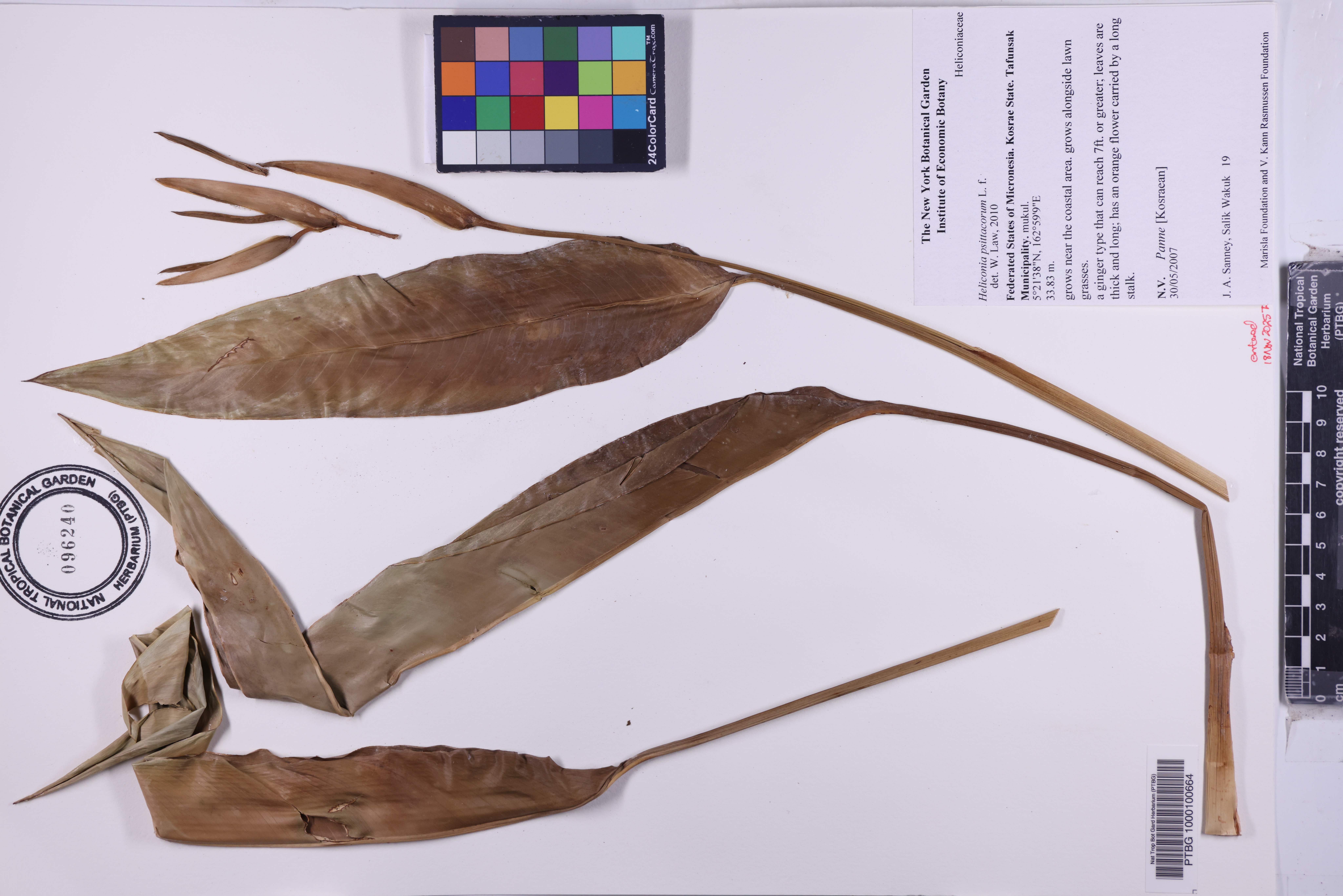 A ginger type plant that can reach 7ft. or greater; leaves are thick and long; has an orange flower carried by a long stalk.