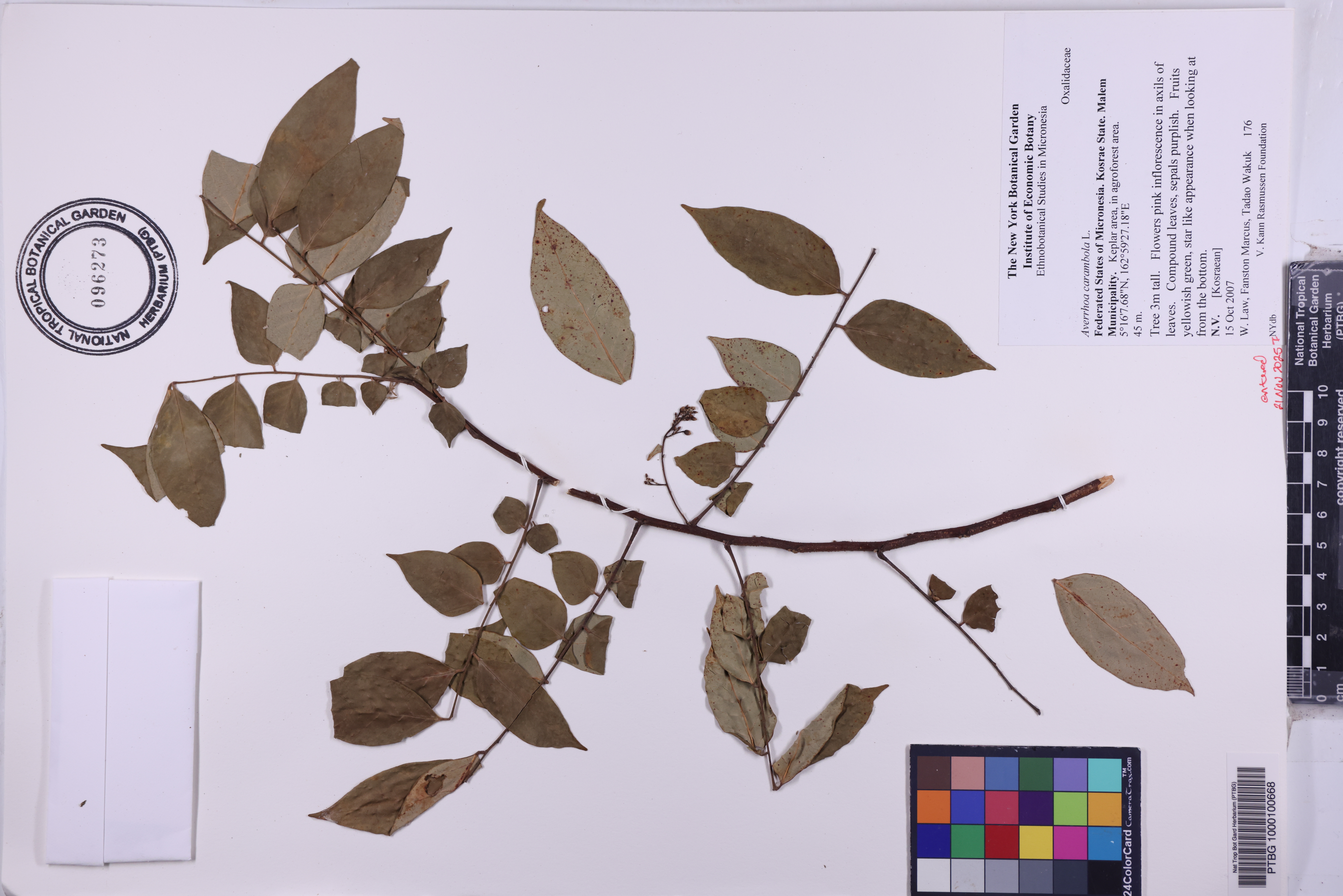 Tree 3m tall. Flowers pink inflorescence in axils of leaves. Compound leaves, sepals purplish. Fruits yellowish green, star like appearance when looking at from the bottom.