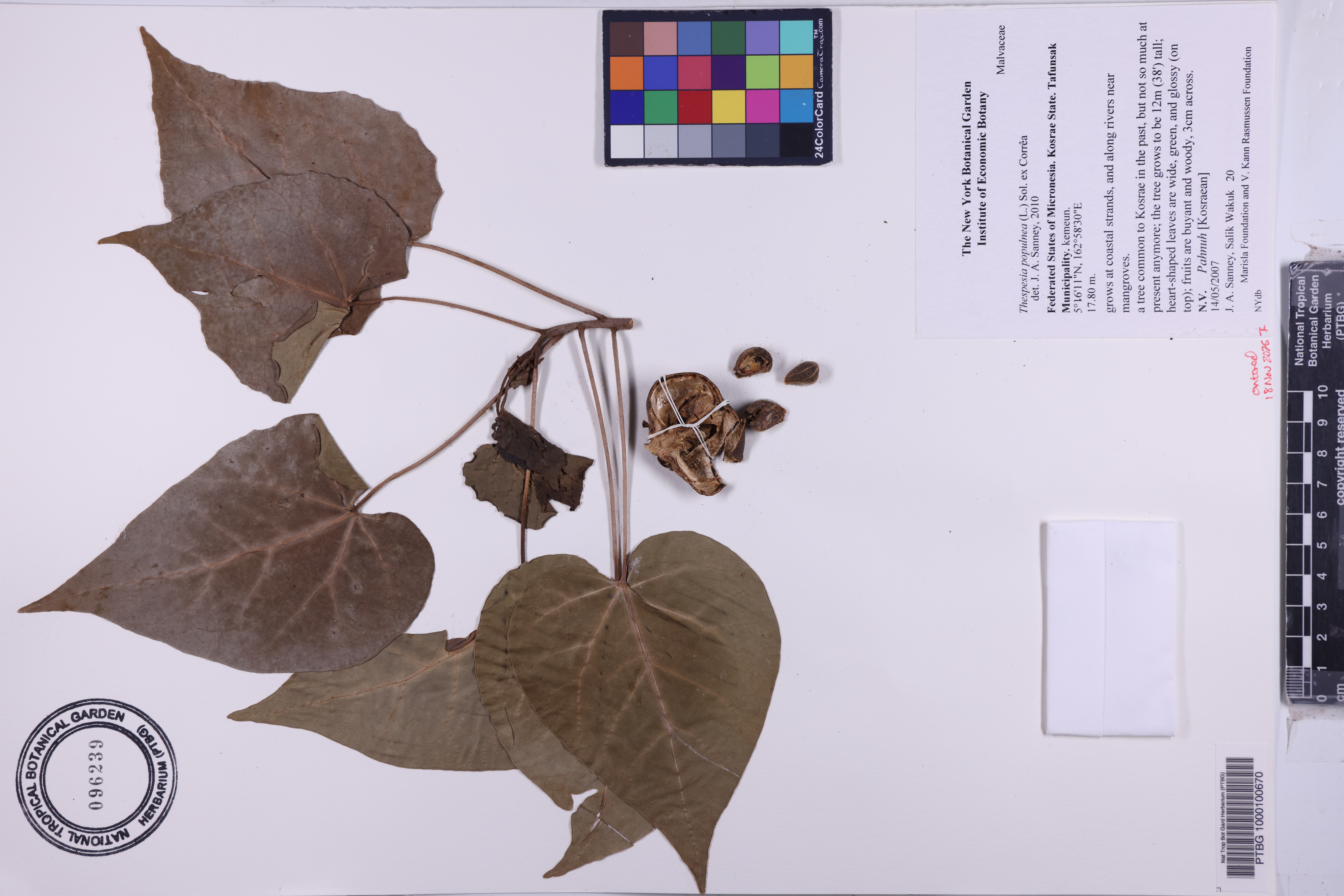A tree common to Kosrae in the past, but not so much at present anymore; the tree grows to be 12m (38) tall; heart-shaped leaves are wide, green, and glossy (on top); fruit are buyant and woody, 3 cm across.