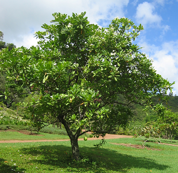 Cerbera odollam is a large shrub or small tree reaching approximately 10 meters in height. Like its relative Cerbera manghas, it has alternate glossy shiny green leaves and fragrant white flowers, however the flowers have a yellow throat instead of red. The fruits are green when young and turn bright red at maturity. The dried fruits (drupes) are 5-10 cm in length. When they fall from the branches, the papery, outer layer falls off exposing a thick fibrous husk. Because of this fibrous layer, the fruits are very light and buoyant, being easily dispersed by ocean currents. The fruits separate into two halves, each containing one very poisonous seed.(See also Cerbera manghas)