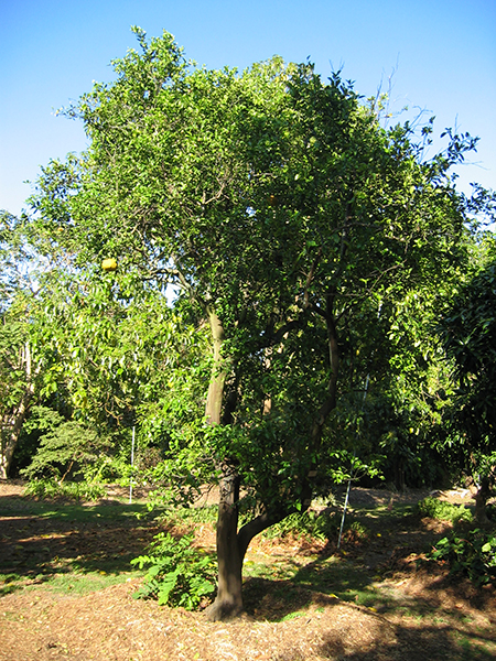 The Rough Lemon Tree reaches 10 to 20 ft (3-6 m) in height and usually has sharp thorns on the twigs. The alternate leaves, reddish when young, become dark-green above, light-green below; are oblong, elliptic or long-ovate, 2 1/2 to 4 1/2 in (6.25-11.25 cm) long, finely toothed, with slender wings on the petioles. The mildly fragrant flowers may be solitary or there may be 2 or more clustered in the leaf axils. Buds are reddish. The opened flowers have 4 or 5 petals 3/4 in (2 cm) long, white on the upper surface (inside), purplish beneath, and 20-40 more or less united stamens with yellow anthers. The fruit is oval with a nipple-like protuberance at the apex; 2 3/4 to 4 3/4 in (7 -12 cm) long; the peel is rough and yellow, aromatic, dotted with oil glands, 1/4 to 3/8 in (6-10 mm) thick. The pulp is pale-yellow, in 8 to 10 segments, juicy and acid.