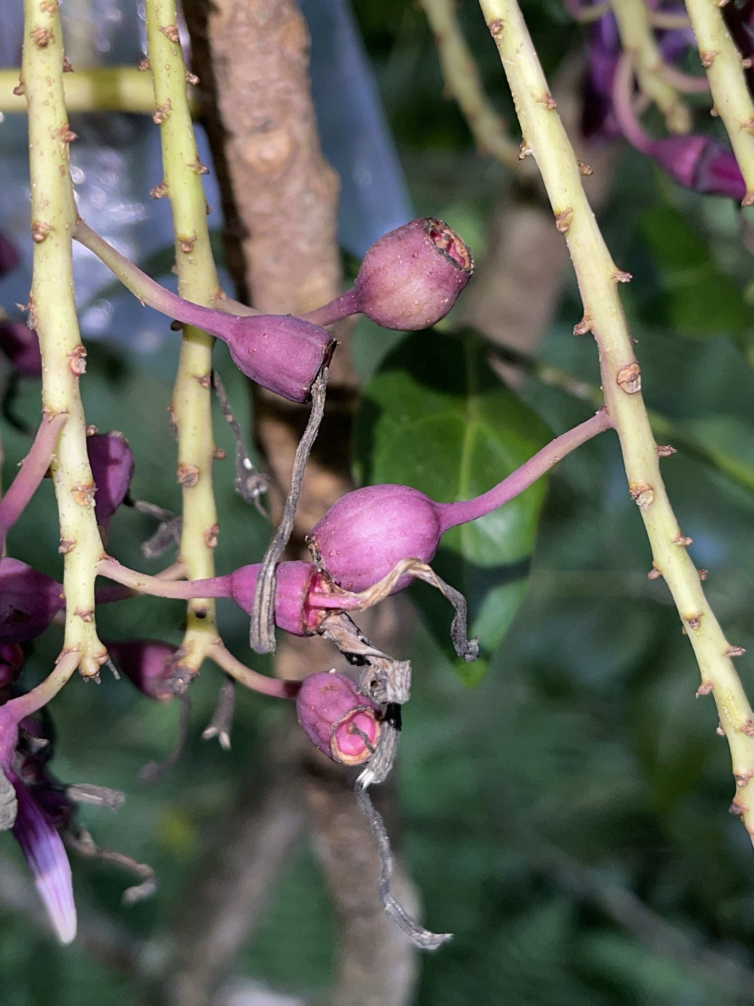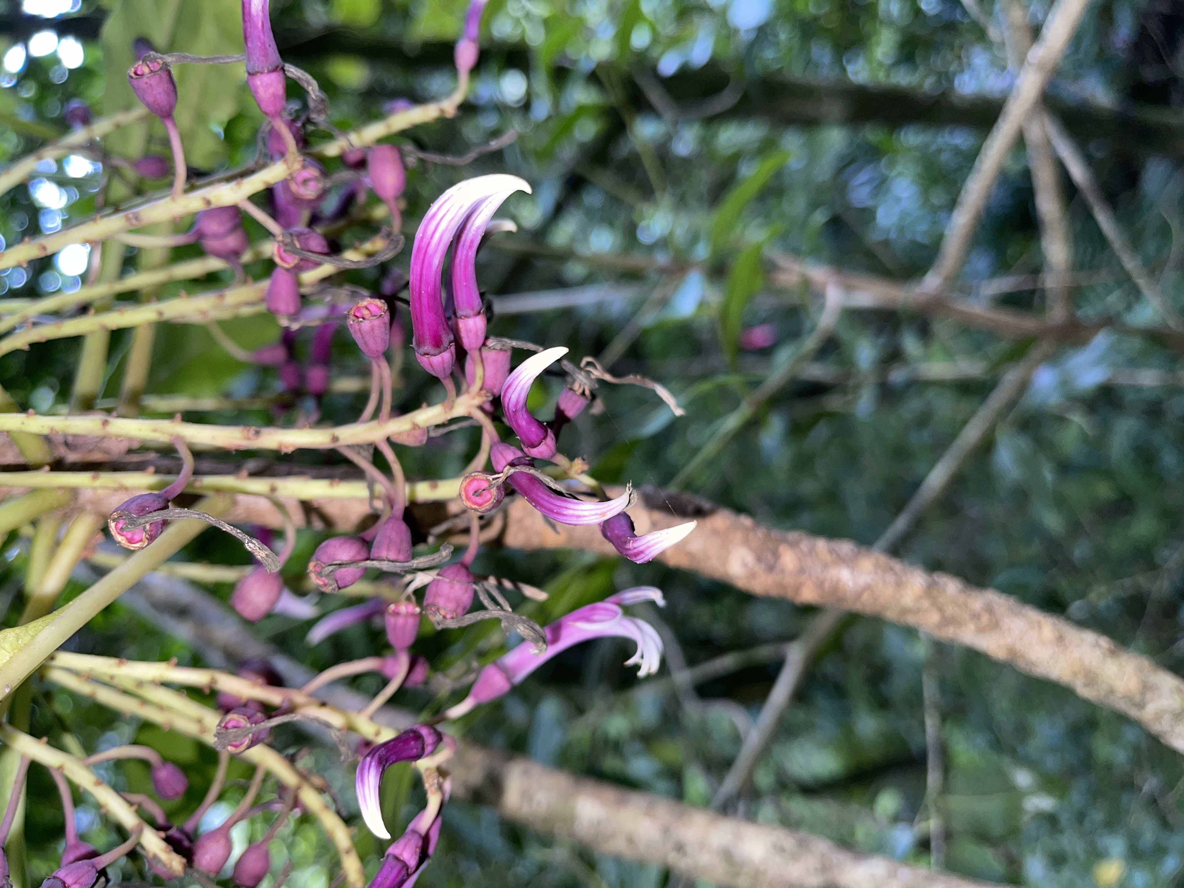 Cyanea hardyi (Haha in Hawaiian) is an endangered branched shrub or tree 1 to 7 meters (3-23 ft) tall. Cyanea hardyi leaves are elliptic to oblanceolate in shape, with blades that are about 18 to 28 cm (7-11 in) long, and 2.5-5 cm (1-2 in) wide. It's inflorescence are 15-30 flowered, and pendent. The berries of Cyanea hardyi are purple, globose, and 8-10 mm long.