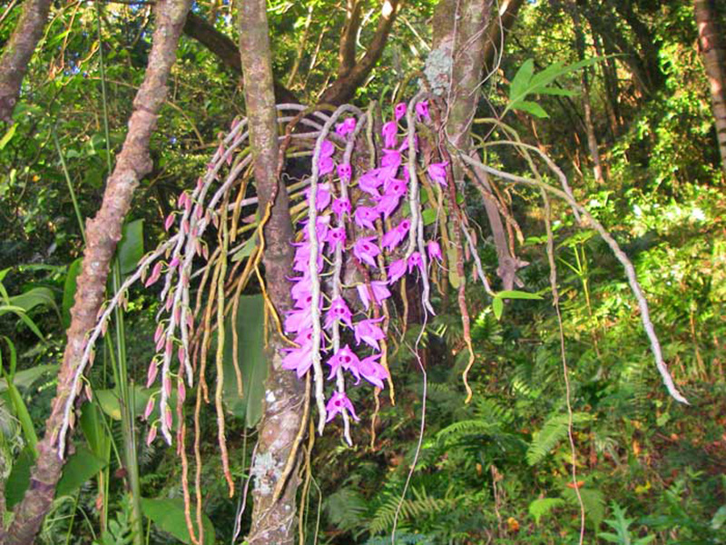 Honohono, or Dendrobium anosmum, is an epiphytic plant that is said to be “deciduous” as it loses its leaves prior to flowering. The plant persists through the production of rhizomes, which are stems that spread out along the surface on which the plant is growing. Buds on the rhizomes develop to produce hanging stems on which leaves are produced. In its native habitat these stems can grow from 1.2 to 3.0 m in length but are usually only 30-60 cm when grown in cultivation. In Dendrobium orchids the stems on which leaves are produced are known as pseudobulbs, a term meaning false bulbs. Like bulbs, pseudobulbs serve as storage organs for the plant. The leaves of Honohono are slightly fleshy and strap-shaped. Honohono flowers are purple-pink and are produced in small clusters of 3-4 flowers. An albino variety, Dendrobium anosmum var. huttonii, exists with white flowers. Honohono fruit are dry at maturity and split open along 3 slits down the length of the dry capsule to release hundreds of small seeds